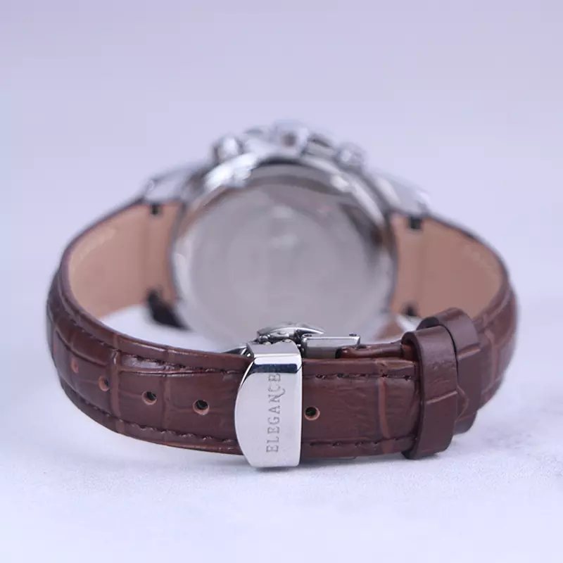 ساعت الگانس زنانه بند چرم قهوه‌ای ظاهری مدرن و جذاب دارد. قاب این ساعت به رنگ استیل نقره‌ای، رنگ ثابت و ضدحساسیت است. در واقع این ساعت، طرح سه موتوره است و صفحات کوچکی که می‌بینید، نمایشی هستند. داشتن اندکس‌های خطی نقره‌ای و عقربه‌‌های شب رنگ به شما این امکان را می‌دهد که در شب و محیط‌های کم نور هم گذر زمان را ببینید. اگر به درون صفحه سفید رنگ ساعت نگاه کنید، نام برند ELEGANCE کنار ساعت 3 قرار دارد. یک دایره کوچک کنار عدد 4 قرار دارد که تقویم ساعت است. بند ساعت از نوع چرم مرغوب است که پوسته پوسته و بریده نمی‌شود، همچنین باعث تعرق و خارش نمی‌شود. قفل این ساعت از مدل پروانه‌ای دکمه‌دار است و ساعت به راحتی از دست نمی‌افتد. این مدل قفل، مثل قفل کمربندی روی بند ترک یا بریدگی ایجاد نمی‌کند و از محبوبترین قفل‌ها است.