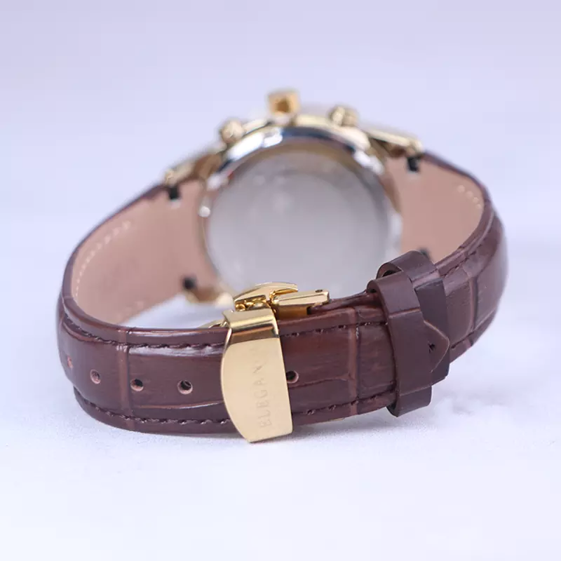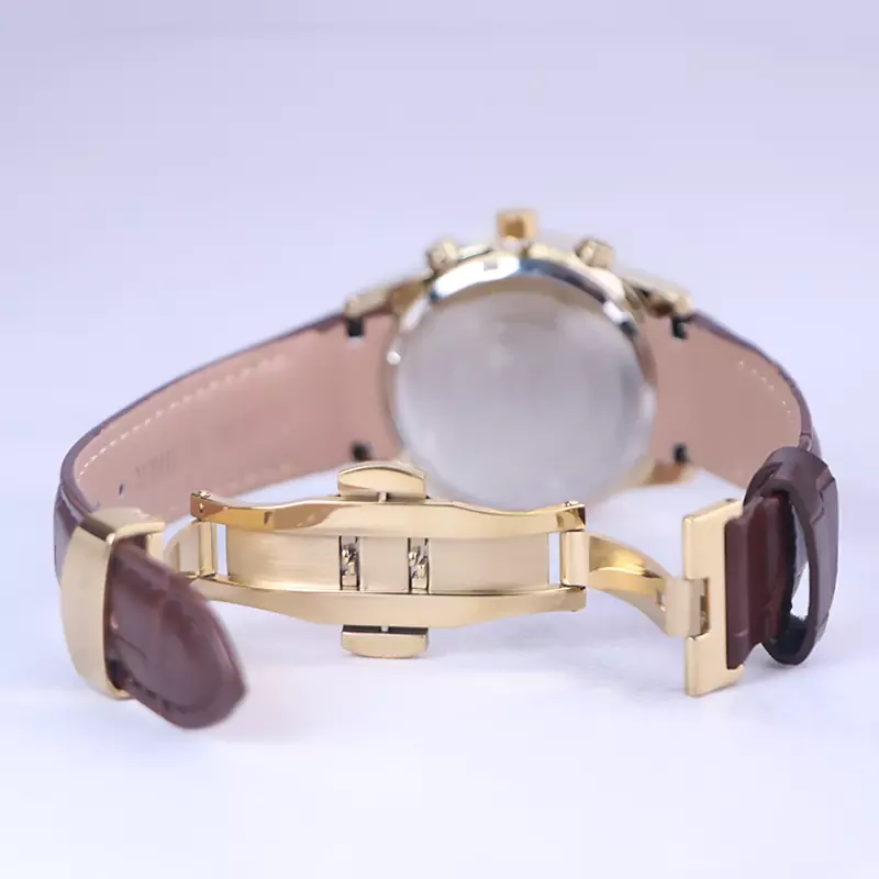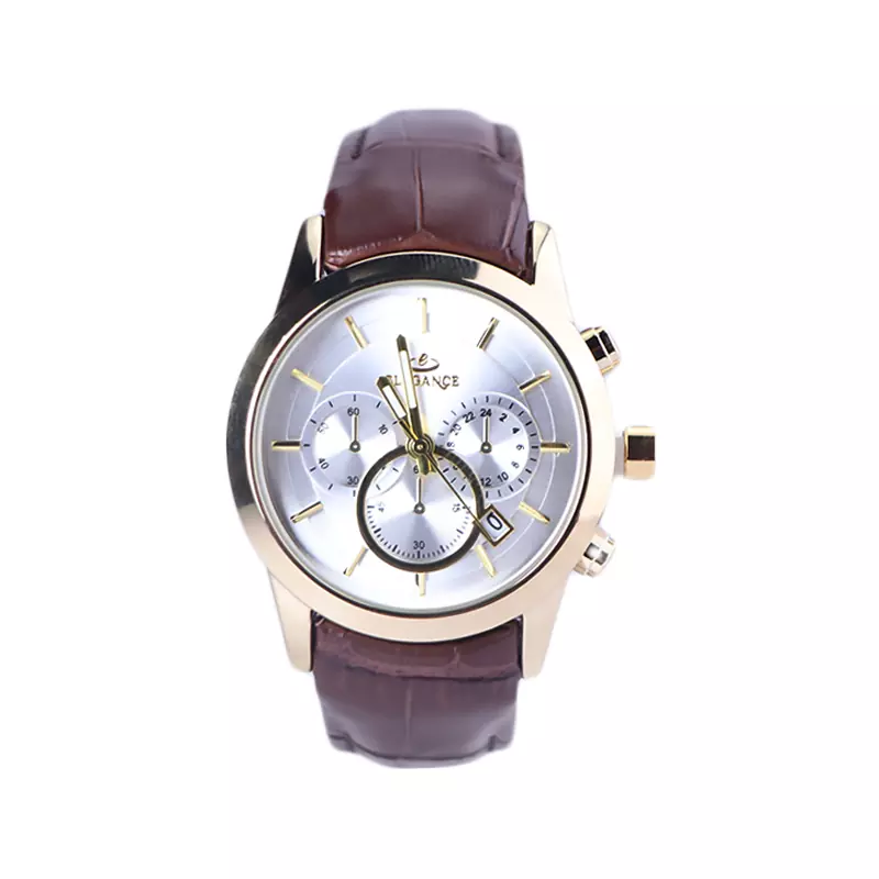 ساعت الگانس زنانه بند چرم قهوهای ظاهری مدرن و جذاب دارد. قاب این ساعت به رنگ استیل طلایی، رنگ ثابت و ضدحساسیت است. در واقع این ساعت، طرح سه موتوره است و صفحات کوچکی که میبینید، نمایشی هستند. داشتن اندکسهای خطی طلایی و عقربههای شب رنگ به شما این امکان را میدهد که در شب و محیطهای کم نور هم گذر زمان را ببینید. اگر به درون صفحه سفید رنگ ساعت نگاه کنید، نام برند ELEGANCE زیر ساعت 12 قرار دارد. یک مربع کوچک کنار عدد 4 قرار دارد که تقویم ساعت است. بند ساعت از نوع چرم مرغوب است که پوسته پوسته و بریده نمیشود، همچنین باعث تعرق و خارش نمیشود. قفل این ساعت از مدل پروانهای دکمهدار است و ساعت به راحتی از دست نمیافتد. این مدل قفل، مثل قفل کمربندی روی بند ترک یا بریدگی ایجاد نمیکند و از محبوبترین قفلها است.