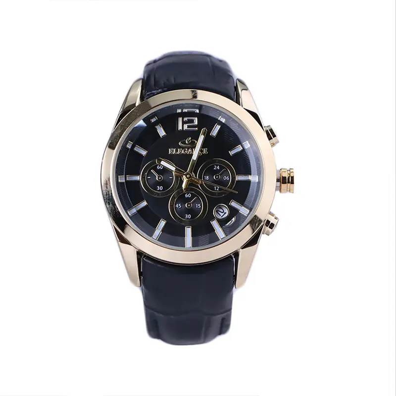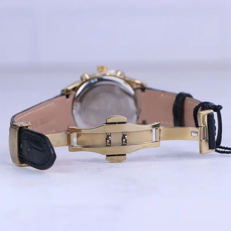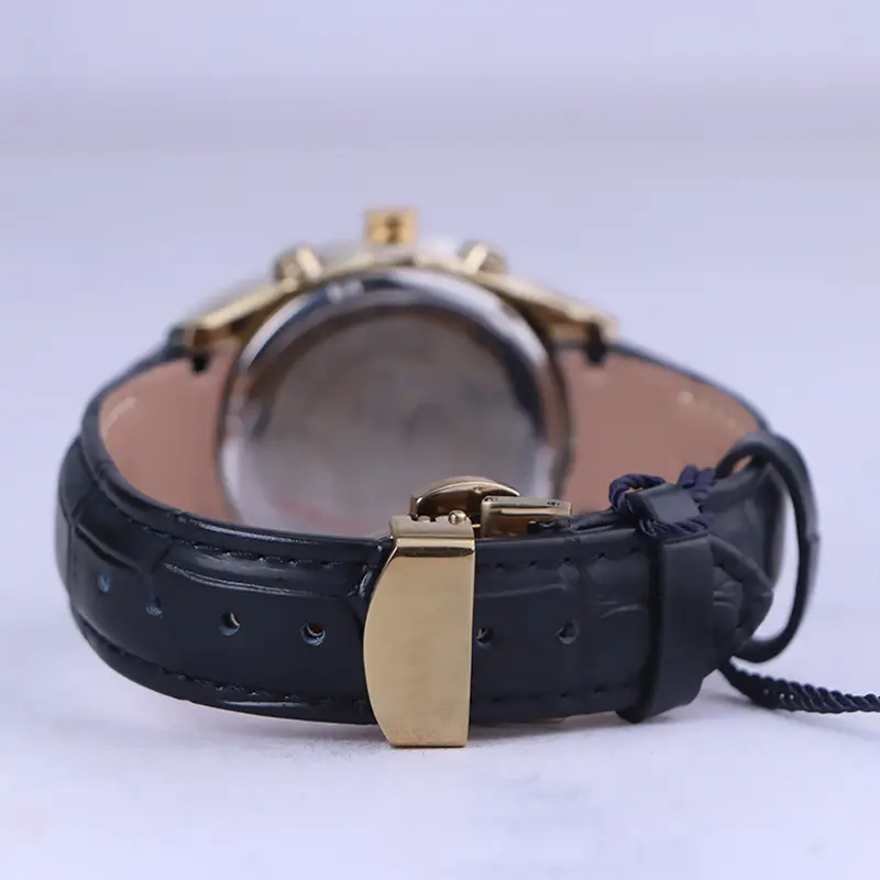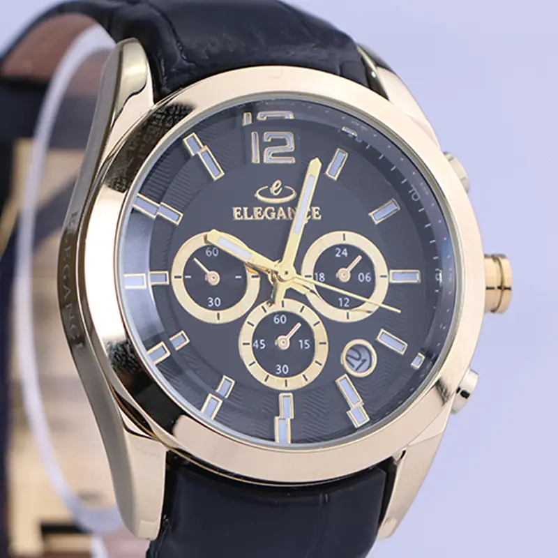 ساعت الگانس زنانه بند چرم مشکی ظاهری مدرن و جذاب دارد. قاب این ساعت به رنگ استیل طلایی، رنگ ثابت و ضدحساسیت است. در واقع این ساعت، طرح سه موتوره است و صفحات کوچکی که میبینید، نمایشی هستند. اگر به درون صفحه مشکی رنگ ساعت نگاه کنید، نام برند ELEGANCE زیر ساعت 12 دیده میشود. یک دایره کوچک بین اعداد 4 و 5 قرار دارد که همان تقویم ساعت است. داشتن اندکسهای خطی شبنما و عقربه های شب رنگ به شما این امکان را میدهد که در شب و محیطهای کم نور هم گذر زمان را ببینید. بند ساعت از نوع چرم مرغوب است که پوسته پوسته و بریده نمیشود، همچنین باعث تعرق و خارش نمیشود. قفل این ساعت از مدل پروانهای دکمهدار است و ساعت به راحتی از دست نمیافتد. این مدل قفل، مثل قفل کمربندی روی بند ترک یا بریدگی ایجاد نمیکند و از محبوبترین قفلها است.