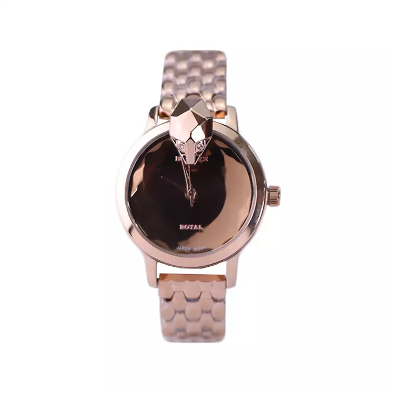 ساعت مچی الگانس زنانه استیل رزگلد ظاهری خاص و جذاب دارد. این ساعت استیل، رنگ ثابت و ضدحساسیت است. اصلیترین چیزی که در ساعت زنانه الگانس توجه ما را به خود جلب میکند، کلهی مار سهبعدی در بالای قاب رزگلد رنگ ساعت است که جلوهای متفاوت و جذاب ایجاد کرده است. صفحهی ساعت رزگلد آینهای است و عقربهها، رزگلد و بدون اندکس است. اگر به صفحهی ساعت نگاه کنید، نام برند الگانس زیر ساعت 12 دیده میشود و شیشهی ساعت تراشکاری شده است. در کنار صفحه یک پیچ کوک برای تنظیم زمان وجود دارد. بند ساعت، فلزی و از نوع استیل مرغوب است که باعث تعرق و خارش نمیشود. بند ساعت طرح پوست ماری و رزگلد است و قفل آن از مدل پروانهای دکمهدار بوده که از دسته قفلهای محکم و مطمئن است.