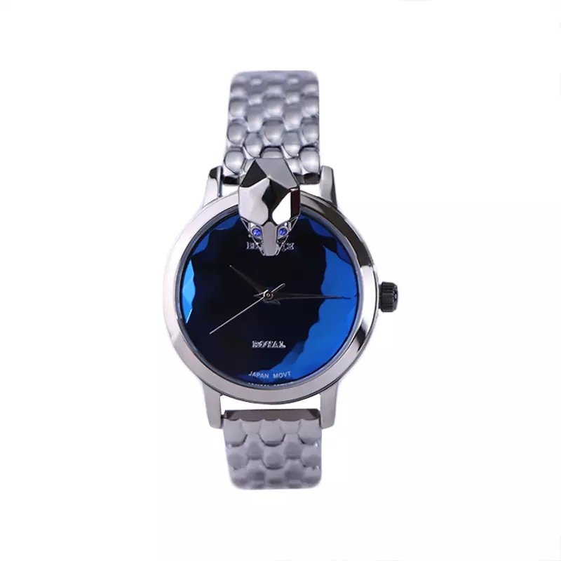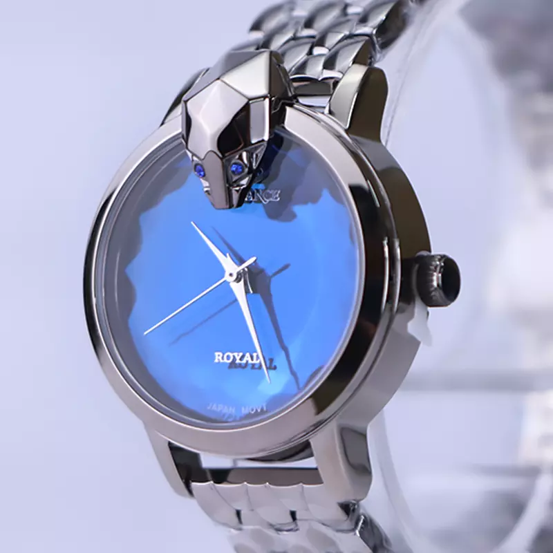 ساعت مچی الگانس زنانه استیل دودی ظاهری خاص و جذاب دارد. این ساعت استیل، رنگ ثابت و ضدحساسیت است. اصلیترین چیزی که در ساعت زنانه الگانس توجه ما را به خود جلب میکند، کلهی مار سهبعدی در بالای قاب دودی رنگ ساعت است که جلوهای متفاوت و جذاب ایجاد کرده است. صفحهی ساعت سرمهای آینهای است و عقربهها، نقرهای و بدون اندکس است. اگر به صفحهی ساعت نگاه کنید، نام برند الگانس زیر ساعت 12 دیده میشود و شیشهی ساعت تراشکاری شده است. در کنار صفحه یک پیچ کوک برای تنظیم زمان وجود دارد. بند ساعت، فلزی و از نوع استیل مرغوب است که باعث تعرق و خارش نمیشود. بند ساعت طرح پوست ماری و دودی است و قفل آن از مدل پروانهای دکمهدار بوده که از دسته قفلهای محکم و مطمئن است.