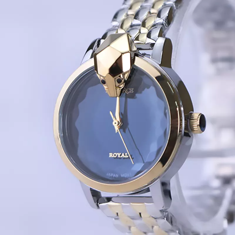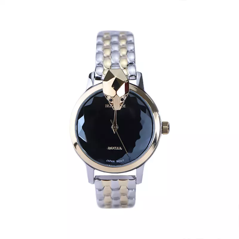 ساعت مچی الگانس زنانه استیل نقرهای طلایی ظاهری خاص و جذاب دارد. این ساعت استیل، رنگ ثابت و ضدحساسیت است. اصلیترین چیزی که در ساعت زنانه الگانس توجه ما را به خود جلب میکند، کلهی مار سهبعدی در بالای قاب طلایی رنگ ساعت است که جلوهای متفاوت و جذاب ایجاد کرده است. صفحهی ساعت مشکی آینهای است و عقربهها، طلایی و بدون اندکس است. اگر به صفحهی ساعت نگاه کنید، نام برند الگانس زیر ساعت 12 دیده میشود و شیشهی ساعت تراشکاری شده است. در کنار صفحه یک پیچ کوک برای تنظیم زمان وجود دارد. بند ساعت، فلزی و از نوع استیل مرغوب است که باعث تعرق و خارش نمیشود. بند ساعت طرح پوست ماری و نقرهای طلایی است و قفل آن از مدل پروانهای دکمهدار بوده که از دسته قفلهای محکم و مطمئن است.