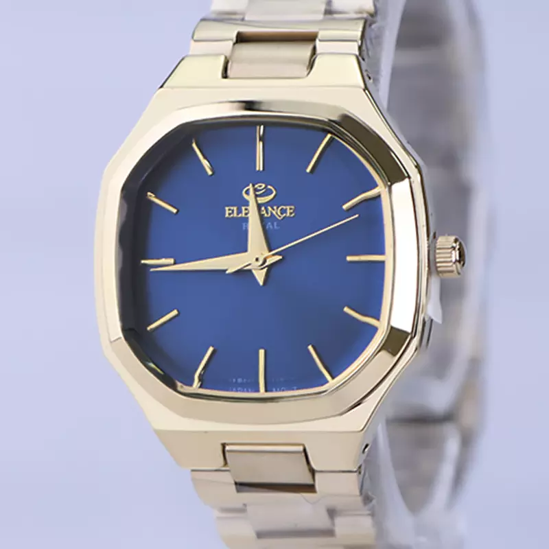 ساعت مچی الگانس زنانه استیل طلایی ظاهری کلاسیک و جذاب دارد. این ساعت استیل، رنگ ثابت و ضدحساسیت است. اصلیترین چیزی که در ساعت زنانه الگانس توجه ما را به خود جلب میکند، قاب چندضلعی و صفحهی آبی ساعت است که ظاهر ساعت را شیک و متفاوت کرده است. عقربهها، طلایی و اندکسها خطی است. اگر به درون صفحهی ساعت نگاه کنید، نام برند الگانس زیر ساعت 12 دیده میشود. در کنار صفحه یک پیچ کوک برای تنظیم زمان وجود دارد. بند ساعت، فلزی و از نوع استیل مرغوب است که باعث تعرق و خارش نمیشود. بند ساعت از بافت ریز و درشت تشکیل شده و طلایی رنگ است. قفل آن از مدل پروانهای دکمهدار است که از دسته قفلهای محکم و مطمئن است.