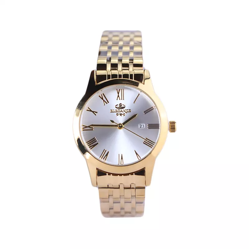 ساعت مچی الگانس زنانه استیل طلایی ظاهری کلاسیک و جذاب دارد. این ساعت استیل، رنگ ثابت و ضدحساسیت است. اصلی‌ترین چیزی که در ساعت زنانه الگانس توجه ما را به خود جلب می‌کند، همخوانی رنگ بند با قاب طلایی رنگ ساعت است. صفحه‌ی ساعت سفید رنگ است. عقربه‌ها، طلایی و اندکس‌ها لاتینی است. اگر به درون صفحه‌ی ساعت نگاه کنید، نام برند الگانس زیر ساعت 12 دیده می‌شود. یک مربع کنار عدد 3 قراردارد که تقویم ساعت است. در کنار صفحه یک پیچ کوک برای تنظیم زمان وجود دارد. بند ساعت، فلزی و از نوع استیل مرغوب است که باعث تعرق و خارش نمی‌شود. بند ساعت از یک بافت ریز و درشت تشکیل شده که طلایی رنگ است و قفل آن از مدل پروانه‌ای دکمه‌دار است که از دسته قفل‌های محکم و مطمئن است.