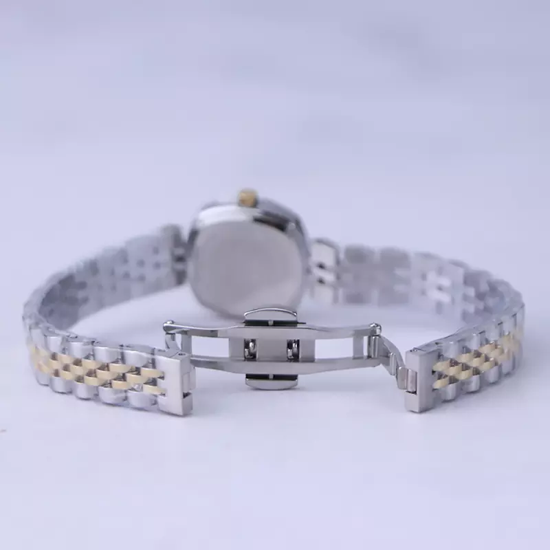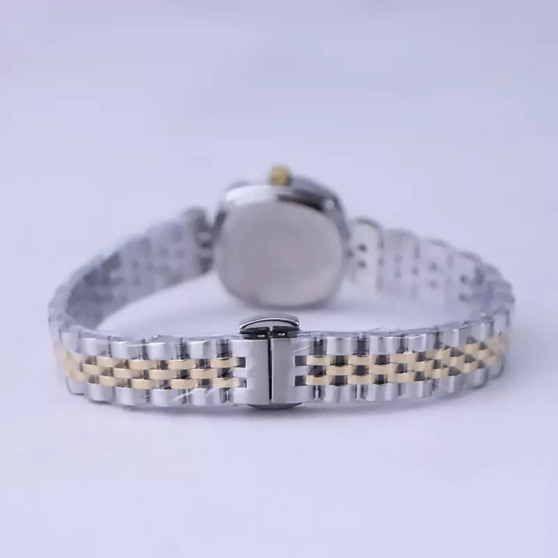 ساعت مچی الگانس زنانه استیل نقرهای طلایی ظاهری کلاسیک و جذاب دارد. این ساعت استیل، رنگ ثابت و ضدحساسیت است. اصلیترین چیزی که در ساعت زنانه الگانس توجه ما را به خود جلب میکند، قاب مربع شکل و صفحهی کج ساعت است که ظاهر ساعت را شیک و متفاوت کرده است. صفحهی ساعت مشکی رنگ است و عقربهها، طلایی و بدون اندکس است. اگر به درون صفحهی ساعت نگاه کنید، نام برند الگانس زیر ساعت 12 دیده میشود. در کنار صفحه یک پیچ کوک برای تنظیم زمان وجود دارد. بند ساعت، فلزی و از نوع استیل مرغوب است که باعث تعرق و خارش نمیشود. قسمت میانی بند ساعت طلایی و کنارههای آن نقرهای رنگ طراحی شده و طرح آن رولکسی است و قفل آن از مدل پروانهای دکمهدار بوده که از دسته قفلهای محکم و مطمئن است.