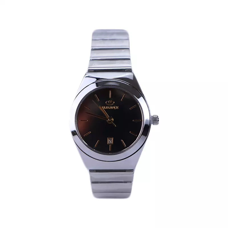 ساعت مچی الگانس زنانه استیل نقرهای ظاهری کلاسیک و جذاب دارد. این ساعت استیل، رنگ ثابت و ضدحساسیت است. اصلیترین چیزی که در ساعت زنانه الگانس توجه ما را به خود جلب میکند، قاب گرد و صفحهی قهوهای رنگ و آینهای ساعت است که ظاهر ساعت را شیک و متفاوت کرده است. عقربهها، طلایی و اندکسها خطی طراحی شده است. اگر به درون صفحهی ساعت نگاه کنید، نام برند Elegance زیر ساعت 12 دیده میشود. یک مربع کوچک بالای عدد 6 قرار دارد که تقویم ساعت است. در کنار صفحه یک پیچ کوک برای تنظیم زمان وجود دارد. بند ساعت، فلزی و از نوع استیل مرغوب است که باعث تعرق و خارش نمیشود. بند ساعت از بافت یکدست تشکیل شده که نقرهای رنگ است و قفل آن از مدل پروانهای دکمهدار است که از دسته قفلهای محکم و مطمئن است.
