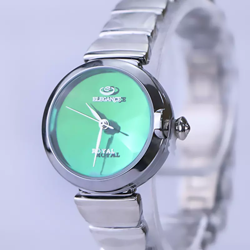 ساعت مچی الگانس زنانه استیل نقره‌ای ظاهری کلاسیک و جذاب دارد. این ساعت استیل، رنگ ثابت و ضدحساسیت است. اصلی‌ترین چیزی که در ساعت زنانه الگانس توجه ما را به خود جلب می‌کند، قاب گرد و صفحه‌ی سبز آینه‌ای ساعت است که ظاهر ساعت را شیک و متفاوت کرده است. عقربه‌ها، نقره‌ای و اندکس‌ ندارد. اگر به درون صفحه‌ی ساعت نگاه کنید، نام برند الگانس زیر ساعت 12 دیده می‌شود. در کنار صفحه یک پیچ کوک برای تنظیم زمان وجود دارد. بند ساعت، فلزی و از نوع استیل مرغوب است که باعث تعرق و خارش نمی‌شود. بند ساعت از بافت یکدست تشکیل شده و نقره‌ای رنگ است. قفل آن از مدل پروانه‌ای دکمه‌دار است که از دسته قفل‌های محکم و مطمئن است.