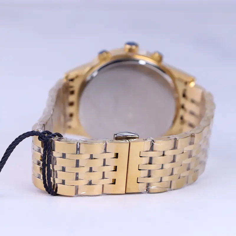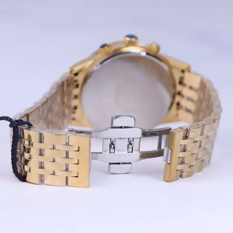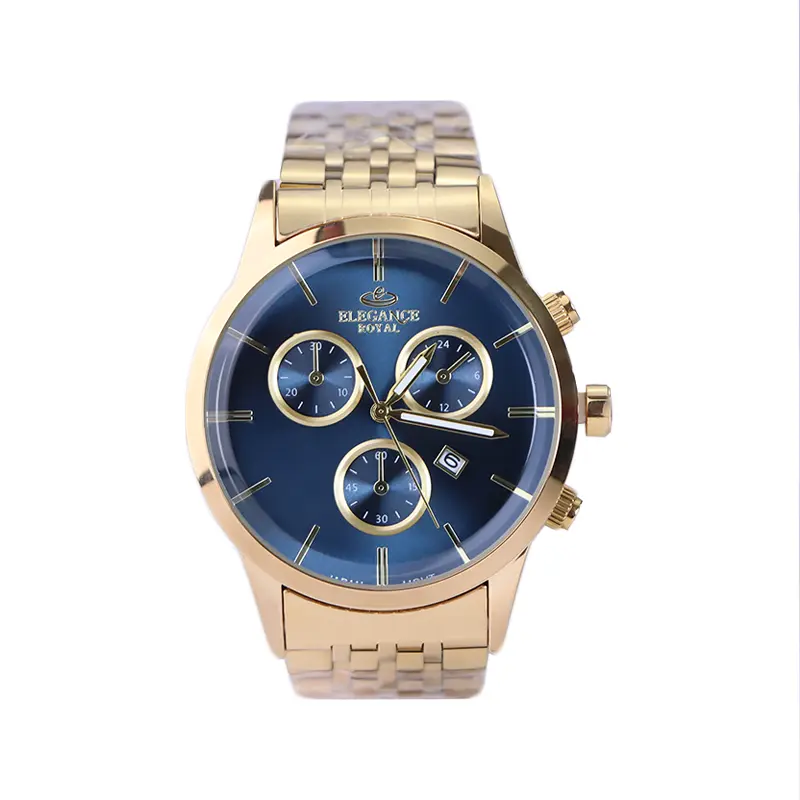 ساعت مچی مردانه فلزی الگانس ظاهری مدرن و جذاب دارد. این ساعت استیل طلایی، رنگ ثابت و ضدحساسیت است. در واقع این ساعت، طرح سه موتوره است و صفحات کوچکی که میبینید، نمایشی هستند. اگر به درون صفحه آبی رنگ ساعت نگاه کنید، اندکسهای ساعت به صورت خطی و عقربهها شبنما طراحی شدهاند. یک مربع کوچک بین اعداد 4 و 5 قرار دارد که تقویم ساعت است. نام برند الگانس زیر ساعت 12 دیده میشود. در کنار صفحه یک پیچ کوک و دو دکمه برای تنظیم زمان وجود دارد. بند ساعت، فلزی و از نوع استیل مرغوب است که باعث تعرق و خارش نمیشود. طرح این بند از یک بافت ریز و درشت تشکیل شده و طلایی رنگ است و قفل آن از مدل پروانه ای دکمهدار است که از دسته قفلهای محکم و مطمئن است.