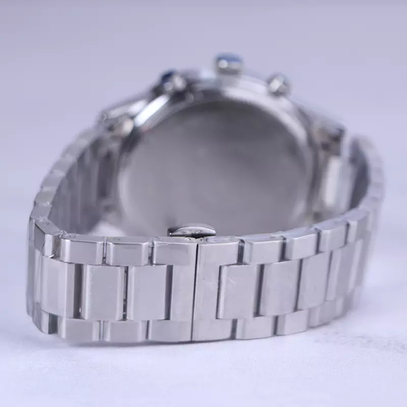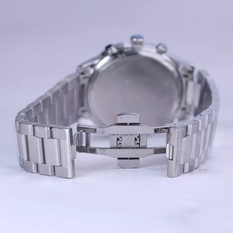 ساعت مچی مردانه فلزی الگانس ظاهری مدرن و جذاب دارد. این ساعت استیل نقرهای، رنگ ثابت و ضدحساسیت است. در واقع این ساعت، طرح سه موتوره است و صفحات کوچکی که میبینید، نمایشی هستند. اگر به درون صفحه مشکی رنگ ساعت نگاه کنید، اندکسهای ساعت به صورت نقرهای و عقربهها نقرهای و شبنما طراحی شدهاند. یک مربع کوچک بین اعداد 4 و 5 قرار دارد که تقویم ساعت است. نام برند الگانس زیر ساعت 12 دیده میشود. در کنار صفحه یک پیچ کوک و دو دکمه برای تنظیم زمان وجود دارد. بند ساعت، فلزی و از نوع استیل مرغوب است که باعث تعرق و خارش نمیشود. طرح این بند از یک بافت ریز و درشت تشکیل شده و نقرهای است و قفل آن از مدل پروانه ای دکمهدار است که از دسته قفلهای محکم و مطمئن است.