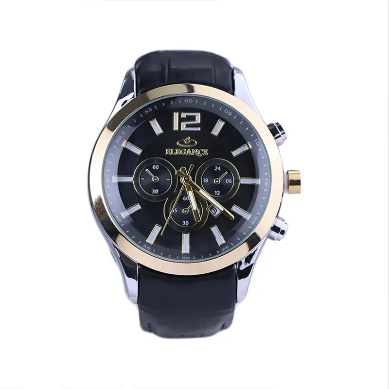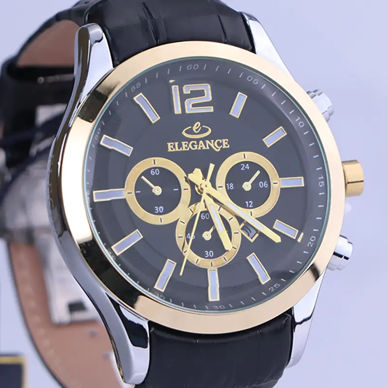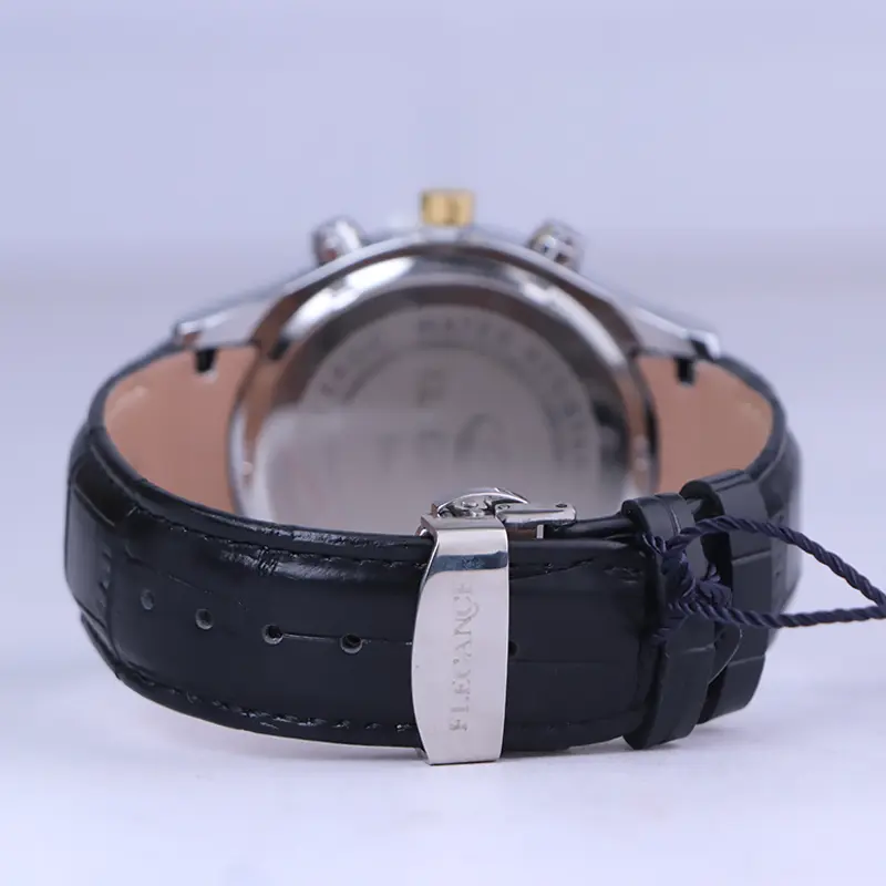 ساعت الگانس مردانه بند چرم مشکی ظاهری مدرن و جذاب دارد. قاب این ساعت به رنگ استیل طلایی/نقرهای، رنگ ثابت و ضدحساسیت است. در واقع این ساعت، طرح سه موتوره است و صفحات کوچکی که میبینید، نمایشی هستند. داشتن اندکسهای خطی شبنما و عقربههای شب رنگ به شما این امکان را میدهد که در شب و محیطهای کم نور هم گذر زمان را ببینید. اگر به درون صفحه مشکی رنگ ساعت نگاه کنید، نام برند ELEGANCE زیر ساعت 12 قرار دارد. یک مربع کوچک بین اعداد 4 و 5 قرار دارد که تقویم ساعت است. بند ساعت از نوع چرم مرغوب است که پوسته پوسته و بریده نمیشود، همچنین باعث تعرق و خارش نمیشود. قفل این ساعت از مدل پروانهای دکمهدار است و ساعت به راحتی از دست نمیافتد. این مدل قفل، مثل قفل کمربندی روی بند ترک یا بریدگی ایجاد نمیکند و از محبوبترین قفلها است.