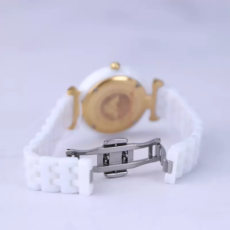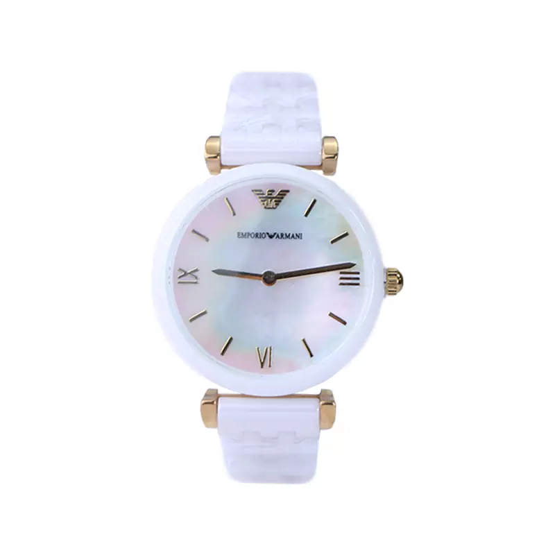 ساعت امپریو آرمانی زنانه سفید ظاهری کلاسیک و جذاب دارد. این ساعت سرامیکی، رنگ ثابت و ضدحساسیت است. اصلی‌ترین چیزی که در ساعت زنانه امپریو آرمانی توجه ما را به خود جلب می‌کند، صفحه صدفی ساعت است که بر شیکی آن افزوده است. اگر به درون ساعت دقت کنید، عقربه‌های ساعت، طلایی و اندکس‌ها به صورت ترکیبی خطی و لاتین طراحی شده‌اند. نام برند امپریو آرمانی زیر ساعت 12 دیده می‌شود. در کنار صفحه یک پیچ کوک برای تنظیم زمان وجود دارد. بند ساعت، سرامیکی و از نوع مرغوب است که باعث تعرق و خارش نمی‌شود. طرح این بند از یک بافت یکدست تشکیل شده است و قفل این ساعت عقربه‌ای زنانه از مدل پروانه ای دکمه‌دار است که از دسته قفل‌های محکم و مطمئن است.