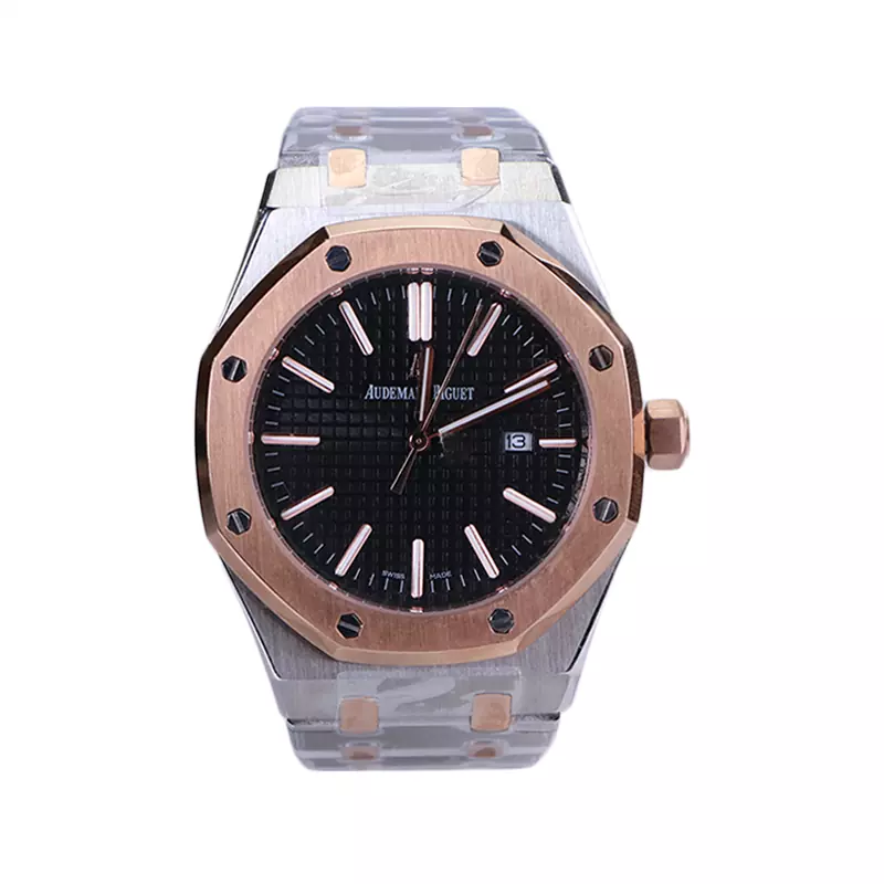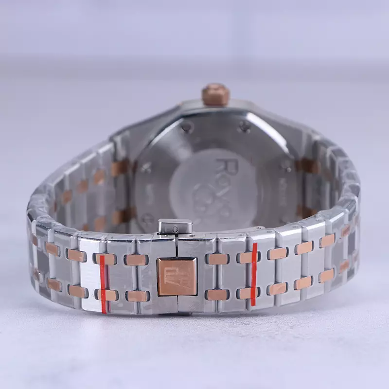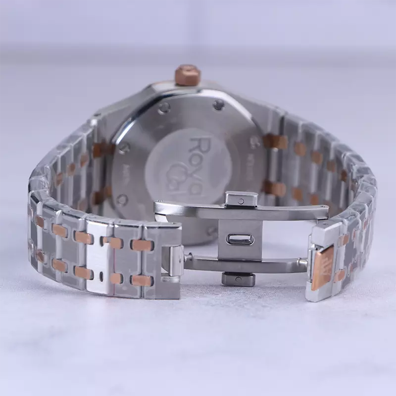 ساعت مچی ای پی مردانه فلزی نقره‌ای رزگلد ظاهری کلاسیک و جذاب دارد. این ساعت بند استیل نقره‌ای رزگلد، رنگ ثابت و ضدحساسیت است. اصلی‌ترین چیزی که در ساعت مردانه ای پی توجه ما را به خود جلب می‌کند، صفحه‌ی مشکی و طرح‌دار آن است که بر شیکی آن افزوده است. قاب ساعت رزگلد و به شکل چند ضلعی است که دور تا دور آن با پیچ‌هایی تزئین شده است. عقربه‌ها، شبنما و اندکس‌های ساعت خطی هستند. در کنار ساعت 3 یک مربع کوچک وجود دارد که نشان دهنده‌ی تقویم ساعت است. اگر به درون صفحه نگاه کنید، نام برند AP زیر ساعت 12 دیده می‌شود. در کنار صفحه یک پیچ کوک برای تنظیم زمان وجود دارد. بند ساعت، فلزی و از نوع استیل مرغوب است که باعث تعرق و خارش نمی‌شود. طرح این بند از یک بافت ریز و درشت تشکیل شده که قسمت میانی رزگلد و کناره‌های آن نقره‌ای رنگ است و قفل آن از مدل پروانه‌ای دکمه‌دار است که از دسته قفل‌های محکم و مطمئن است.
