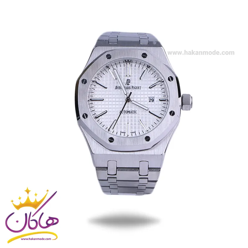 ساعت مچی ای پی مردانه فلزی نقرهای ظاهری کلاسیک و جذاب دارد. این ساعت بند استیل نقرهای، رنگ ثابت و ضدحساسیت است. اصلیترین چیزی که در ساعت مردانه ای پی توجه ما را به خود جلب میکند، صفحهی سفید و طرحدار آن است که بر شیکی آن افزوده است. قاب ساعت به شکل چند ضلعی است که دور تا دور آن با پیچهایی تزئین شده است. عقربهها، شبنما و اندکسهای ساعت خطی هستند. در کنار ساعت 3 یک مربع کوچک وجود دارد که نشان دهندهی تقویم ساعت است. اگر به درون صفحه نگاه کنید، نام برند AP زیر ساعت 12 دیده میشود. در کنار صفحه یک پیچ کوک برای تنظیم زمان وجود دارد. بند ساعت، فلزی و از نوع استیل مرغوب است که باعث تعرق و خارش نمیشود. طرح این بند از یک بافت ریز و درشت تشکیل شده است و قفل آن از مدل پروانهای دکمهدار است که از دسته قفلهای محکم و مطمئن است.