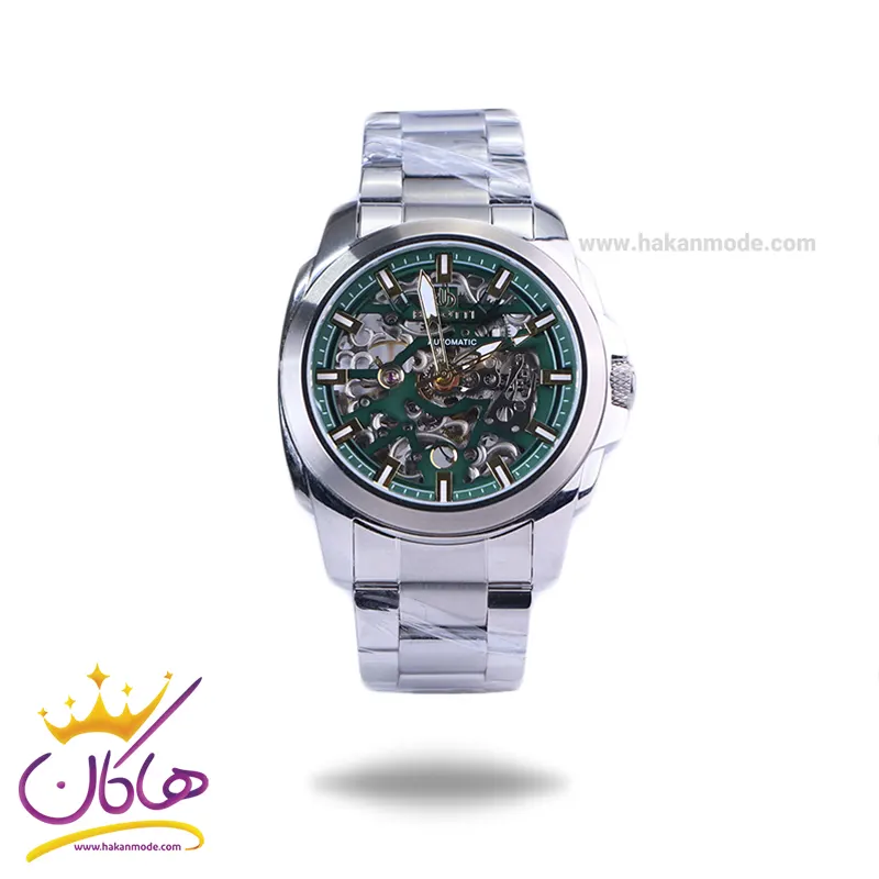 ساعت مچی بیگوتی مردانه فلزی اتوماتیک ظاهری مدرن و جذاب دارد. این ساعت استیل نقرهای، رنگ ثابت و ضدحساسیت است. علاوه بر ویژگیهای ظاهری اگر به داخل ساعت نگاه کنید در وسط صفحه قطعات و اجزای موتور را مشاهده میکنید که جلوهای متفاوت نسبت به ساعتهای نرمال را نشان میدهد. اصطلاحا به این نوع صفحهها اسکلتون میگویند. داشتن موتور مکانیکی اوتومات آن را از باقی ساعتها متفاوت ساخته، به طور خلاصه کارکرد ساعت اتوماتیک با حرکت منظم مچ دست، در ارتباط است. اگر این ساعتها را به صورت منظم و روزانه، استفاده نمایید، احتیاجی به بازسازی نخواهند داشت. صفحهی ساعت سبز رنگ است و اندکسهای این ساعت شبنما و طلایی و عقربههای آن شبنما هستند. نام برند BIGOTTI زیر ساعت 12 دیده میشود. در کنار صفحه یک پیچ کوک برای تنظیم زمان وجود دارد. بند ساعت، از بافت یکدست تشکیل شده و به رنگ نقرهای است. همچنین جنس بند فلزی و از نوع استیل مرغوب است که باعث تعرق و خارش نمیشود. قفل آن از مدل دوتکه ضامندار است که از دسته قفلهای محکم و مطمئن است.