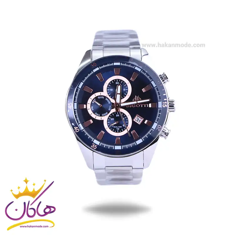 ساعت بیگوتی مردانه فلزی ظاهری مدرن و جذاب دارد. این ساعت استیل نقرهای، رنگ ثابت و ضدحساسیت است. اگر به داخل ساعت نگاه کنید، صفحهی این ساعت به رنگ سورمه ای است و سه صفحه دایرهای کوچک قاب رزگلد میبینید که هر کدام از آنها نشان دهندهی پارامتری خاص هستند. یک صفحه که سمت چپ قرار دارد روزهای هفته را نشان میدهد. صفحهی بالایی ساعت را به صورت 24 ساعته نشان میدهد. اگر از افرادی هستید که امور خود را بر اساس تایم 24 ساعته تنظیم میکنید این صفحه کوچک به کار شما میآید. صفحهی پایینی، dual time یا دو زمانه است. ساعت دو زمانه ساعتی است که به طور هم زمان میتواند دو زمان مختلف مربوط به دو منطقه متفاوت را نمایش دهد. به صورتی که میتوانید با داشتن این ساعت زمان دو کشور متفاوت را در صفحهی این ساعت داشته باشید. یک مربع کوچک بین اعداد 4 و 5 قرار دارد که همان تقویم ساعت است. بند ساعت، از بافت یکدستی تشکیل شده و از نوع فلز مرغوب است که باعث تعرق و خارش نمیشود. اندکسهای این ساعت به صورت خطی رزگلد و عقربههای آن شبنما طراحی شدهاند. لوگوی برند بیگوتی را کنار عدد 3 میبینید. قفل این ساعت از نوع دوتکه دکمهدار است. در کنار صفحه یک پیچ کوک و دو دکمه برای تنظیم زمان وجود دارد.