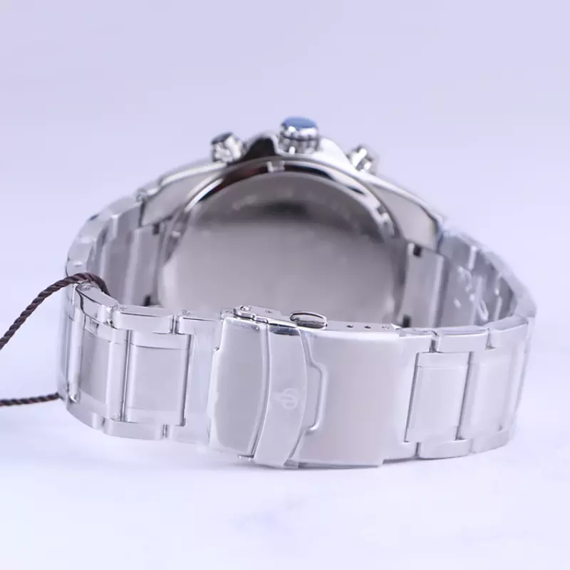 ساعت بیگوتی مردانه فلزی ظاهری مدرن و جذاب دارد. این ساعت استیل نقرهای، رنگ ثابت و ضدحساسیت است. اگر به داخل ساعت نگاه کنید، صفحهی این ساعت به رنگ مشکی است و سه صفحه دایرهای کوچک میبینید که هر کدام از آنها نشان دهندهی پارامتری خاص هستند. یک صفحه که سمت چپ قرار دارد روزهای هفته را نشان میدهد. صفحهی سمت راست ساعت را به صورت 24 ساعته نشان میدهد. اگر از افرادی هستید که امور خود را بر اساس تایم 24 ساعته تنظیم میکنید این صفحه کوچک به کار شما میآید. صفحهی پایینی، dual time یا دو زمانه است. ساعت دو زمانه ساعتی است که به طور هم زمان میتواند دو زمان مختلف مربوط به دو منطقه متفاوت را نمایش دهد. به صورتی که میتوانید با داشتن این ساعت زمان دو کشور متفاوت را در صفحهی این ساعت داشته باشید. یک مربع کوچک بین اعداد 4 و 5 قرار دارد که همان تقویم ساعت است. بند ساعت، از بافت یکدستی تشکیل شده و از نوع فلز مرغوب است که باعث تعرق و خارش نمیشود. اندکسهای این ساعت به صورت خطی شبنما و عقربههای آن شبنما طراحی شدهاند. لوگوی برند بیگوتی را زیر عدد 12 میبینید. قفل این ساعت از نوع دوتکه دکمهدار است. در کنار صفحه یک پیچ کوک و دو دکمه برای تنظیم زمان وجود دارد.