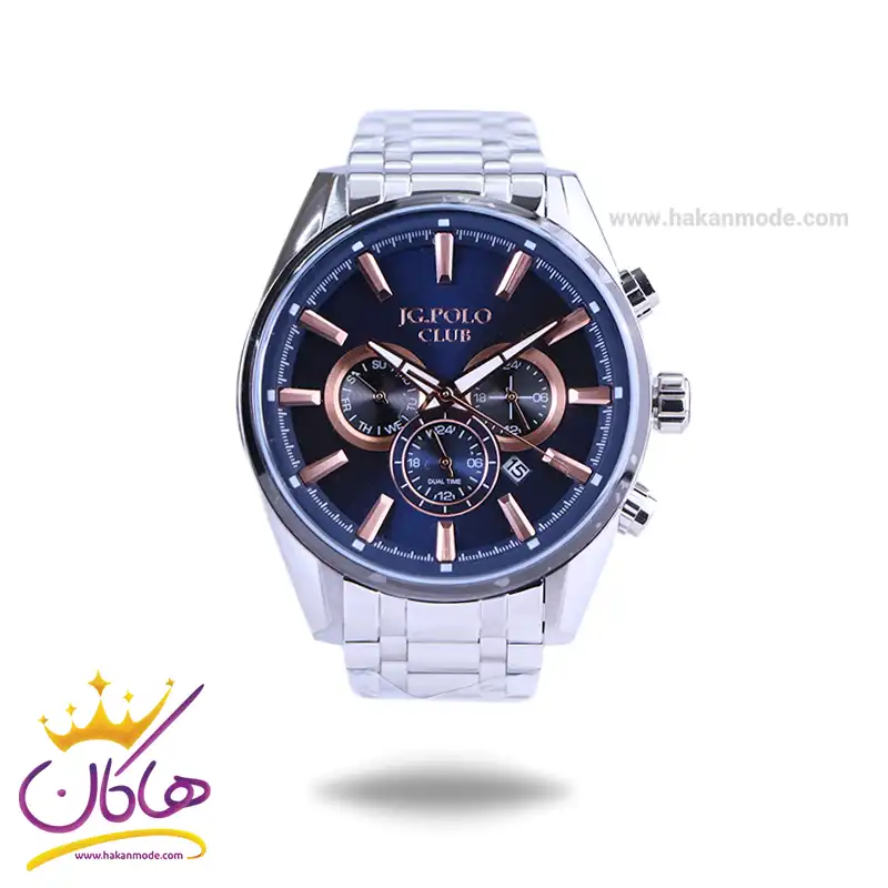 ساعت مچی جی جی پولو مردانه فلزی ظاهری مدرن و جذاب دارد. این ساعت استیل نقرهای، رنگ ثابت و ضدحساسیت است. اگر به داخل ساعت نگاه کنید، صفحهی این ساعت به رنگ سورمهای است و سه صفحه دایرهای کوچک میبینید که هر کدام از آنها نشان دهندهی پارامتری خاص هستند. یک صفحه که سمت چپ قرار دارد روزهای هفته را نشان میدهد. صفحهی سمت راست ساعت را به صورت 24 ساعته نشان میدهد. اگر از افرادی هستید که امور خود را بر اساس تایم 24 ساعته تنظیم میکنید این صفحه کوچک به کار شما میآید. صفحهی پایینی، dual time یا دو زمانه است. ساعت دو زمانه ساعتی است که به طور هم زمان میتواند دو زمان مختلف مربوط به دو منطقه متفاوت را نمایش دهد. به صورتی که میتوانید با داشتن این ساعت زمان دو کشور متفاوت را در یک صفحه داشته باشید. یک مربع کوچک بین اعداد ۴و ۵ وجود دارد که همان تقویم ساعت است. بند ساعت فلزی با بافتهای ریز و درشت و از نوع مرغوب است که باعث تعرق و خارش نمیشود. اندکسهای این ساعت به صورت خطی رزگلد و عقربههای آن شبنما طراحی شدهاند. لوگوی برند جی جی پولو کلاب را زیر عدد ۱۲ میبینید. قفل این ساعت از نوع دوتکه ضامندار است و ساعت به راحتی از دست نمیافتد. در کنار صفحه یک پیچ کوک و دو دکمه برای تنظیم زمان وجود دارد.