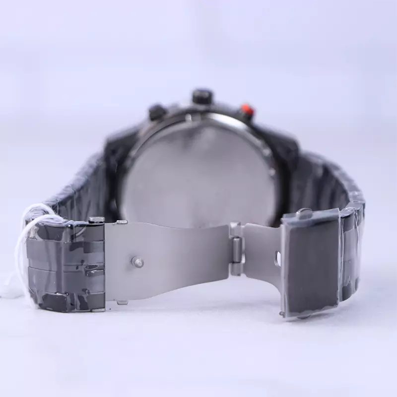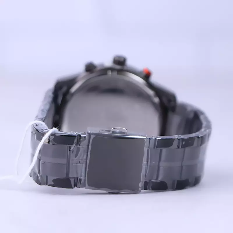 ساعت مچی جی جی پولو مردانه فلزی ظاهری مدرن و جذاب دارد. این ساعت استیل مشکی، رنگ ثابت و ضدحساسیت است. اگر به داخل ساعت نگاه کنید، صفحهی این ساعت به رنگ نقرهای است که حاشیهی آن یک نوار قرمز رنگ وجود دارد که ظاهر ساعت را جذابتر کرده است. درون ساعت سه صفحه دایرهای کوچک میبینید که هر کدام از آنها نشان دهندهی پارامتری خاص هستند. یک صفحه که سمت راست قرار دارد روزهای هفته را نشان میدهد. صفحهی سمت چپ ساعت را به صورت 24 ساعته نشان میدهد. اگر از افرادی هستید که امور خود را بر اساس تایم 24 ساعته تنظیم میکنید این صفحه کوچک به کار شما میآید. صفحهی پایینی همان تقویم ساعت است. بند ساعت فلزی با بافتهای ریز و درشت و از نوع مرغوب است که باعث تعرق و خارش نمیشود. اندکسهای این ساعت به صورت خطی نقرهای و عقربههای آن شبنما طراحی شدهاند. لوگوی برند جی جی پولو کلاب را زیر عدد ۱۲ میبینید. در کنار صفحه یک پیچ کوک و دو دکمه برای تنظیم زمان وجود دارد.