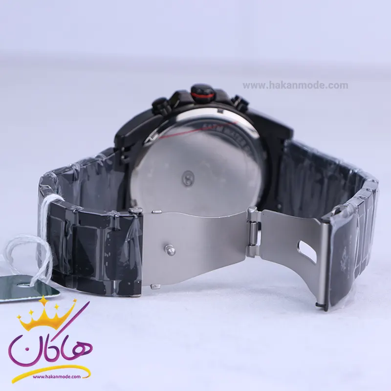 ساعت جی جی پولو مردانه فلزی ظاهری مدرن و جذاب دارد. این ساعت استیل مشکی، رنگ ثابت و ضدحساسیت است. اگر به داخل ساعت نگاه کنید، صفحهی این ساعت به رنگ مشکی است و سه صفحه دایرهای کوچک میبینید که هر کدام از آنها نشان دهندهی پارامتری خاص هستند. یک صفحه که سمت راست قرار دارد روزهای هفته را نشان میدهد. صفحهی سمت چپ ساعت را به صورت 24 ساعته نشان میدهد. اگر از افرادی هستید که امور خود را بر اساس تایم 24 ساعته تنظیم میکنید این صفحه کوچک به کار شما میآید. یک صفحه که پایین قرار دارد روزهای ماه را نشان میدهد. بند ساعت، از یک بافت ریز و درشت تشکیل شده و از نوع فلز مرغوب است که باعث تعرق و خارش نمیشود. اندکسهای این ساعت به صورت خطی شبنما و عقربههای آن قرمز و شبنما طراحی شدهاند. لوگوی برند جی جی پولو کلاب را زیر عدد 12 میبینید. قفل این ساعت از نوع دوتکه دکمهدار است. در کنار صفحه یک پیچ کوک و دو دکمه برای تنظیم زمان وجود دارد.