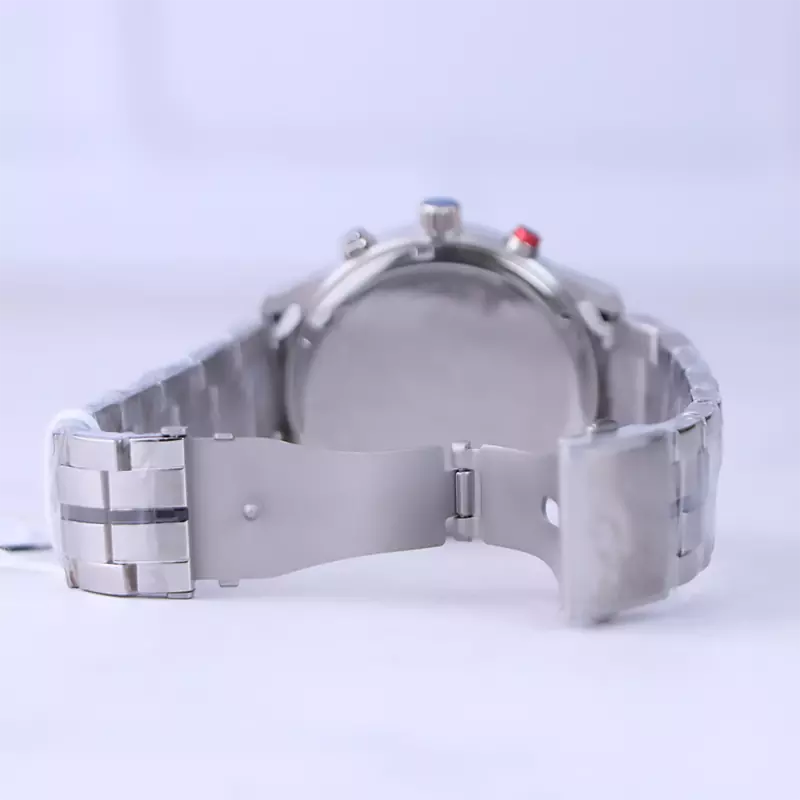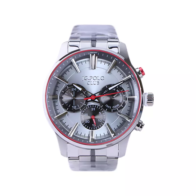 ساعت مچی جی جی پولو مردانه فلزی ظاهری مدرن و جذاب دارد. این ساعت استیل نقرهای، رنگ ثابت و ضدحساسیت است. اگر به داخل ساعت نگاه کنید، صفحهی این ساعت به رنگ نقرهای است که حاشیهی آن یک نوار قرمز رنگ وجود دارد که ظاهر ساعت را جذابتر کرده است. درون ساعت سه صفحه دایرهای کوچک میبینید که هر کدام از آنها نشان دهندهی پارامتری خاص هستند. یک صفحه که سمت راست قرار دارد روزهای هفته را نشان میدهد. صفحهی سمت چپ ساعت را به صورت 24 ساعته نشان میدهد. اگر از افرادی هستید که امور خود را بر اساس تایم 24 ساعته تنظیم میکنید این صفحه کوچک به کار شما میآید. صفحهی پایینی همان تقویم ساعت است. بند ساعت فلزی با بافتهای ریز و درشت و از نوع مرغوب است که باعث تعرق و خارش نمیشود. اندکسهای این ساعت به صورت خطی نقرهای و عقربههای آن شبنما طراحی شدهاند. لوگوی برند جی جی پولو کلاب را زیر عدد ۱۲ میبینید. در کنار صفحه یک پیچ کوک و دو دکمه برای تنظیم زمان وجود دارد.
