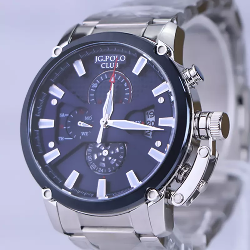 ساعت مچی جی جی پولو مردانه فلزی ظاهری مدرن و جذاب دارد. این ساعت استیل نقره‌ای، رنگ ثابت و ضدحساسیت است. اگر به داخل ساعت نگاه کنید، صفحه‌ی این ساعت به رنگ سورمه ای است و سه صفحه دایره‌ای کوچک می‌بینید که هر کدام از آنها نشان دهنده‌ی پارامتری خاص هستند. یک صفحه که سمت چپ قرار دارد روز‌های هفته را نشان می‌دهد. صفحه‌ی پایینی ساعت را به صورت 24 ساعته نشان می‌دهد. اگر از افرادی هستید که امور خود را بر اساس تایم 24 ساعته تنظیم می‌کنید این صفحه کوچک به کار شما می‌آید. صفحه‌ی بالایی، dual time یا دو زمانه است. ساعت دو زمانه ساعتی است که به طور هم زمان می‌تواند دو زمان مختلف مربوط به دو منطقه متفاوت را نمایش دهد. به صورتی که می‌توانید با داشتن این ساعت زمان دو کشور متفاوت را در یک صفحه داشته باشید. یک اسکرول کوچک بین اعداد 4 و 2 وجود دارد که همان تقویم ساعت است. بند ساعت فلزی با بافت‌های ریز و درشت و از نوع مرغوب است که باعث تعرق و خارش نمی‌شود. اندکس‌های این ساعت به صورت خطی نقره‌ای و عقربه‌های آن شبنما طراحی شده‌اند. لوگوی برند جی جی پولو کلاب را روی عدد ۱۲ می‌بینید. قفل این ساعت از نوع دوتکه دکمه‌دار است و ساعت به راحتی از دست نمی‌افتد. در کنار صفحه یک پیچ کوک و دو دکمه برای تنظیم زمان وجود دارد.