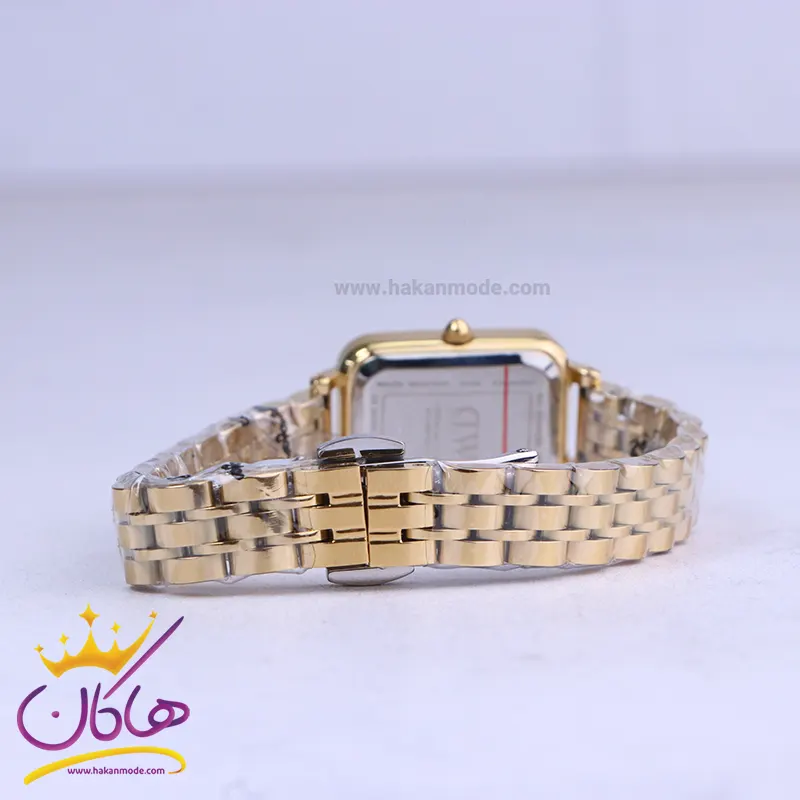 ساعت دنیل ولینگتون زنانه فلزی طلایی ظاهری کلاسیک و جذاب دارد. این ساعت استیل طلایی، رنگ ثابت و ضدحساسیت است. اصلیترین چیزی که در ساعت زنانه دنیل ولینگتون توجه ما را به خود جلب میکند، قاب مستطیل شکل و طلایی رنگ ساعت است که بر شیکی آن افزوده است. اگر به درون ساعت دقت کنید، صفحهی ساعت سفید رنگ است که عقربهها نیز، طلایی و اندکسها لاتین و طلایی طراحی شدهاند. نام برند دنیل ولینگتون زیر ساعت 12 دیده میشود. در کنار صفحه یک پیچ کوک برای تنظیم زمان وجود دارد. بند ساعت، فلزی و از نوع استیل مرغوب است که باعث تعرق و خارش نمیشود. طرح این بند از یک بافت ریز و درشت تشکیل شده که طلایی است و قفل این ساعت عقربهای زنانه از مدل پروانه ای دکمهدار است که از دسته قفلهای محکم و مطمئن است.