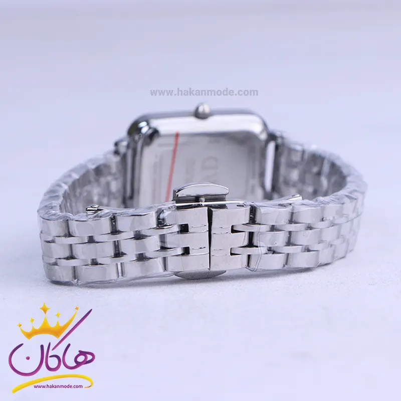 ساعت دنیل ولینگتون زنانه فلزی نقرهای ظاهری کلاسیک و جذاب دارد. این ساعت استیل نقرهای، رنگ ثابت و ضدحساسیت است. اصلیترین چیزی که در ساعت زنانه دنیل ولینگتون توجه ما را به خود جلب میکند، قاب مستطیل شکل و نقرهای رنگ ساعت است که بر شیکی آن افزوده است. اگر به درون ساعت دقت کنید، صفحهی ساعت سفید رنگ است که عقربهها نیز، نقرهای و اندکسها خطی و نقرهای طراحی شدهاند. نام برند دنیل ولینگتون زیر ساعت 12 دیده میشود. در کنار صفحه یک پیچ کوک برای تنظیم زمان وجود دارد. بند ساعت، فلزی و از نوع استیل مرغوب است که باعث تعرق و خارش نمیشود. طرح این بند از یک بافت ریز و درشت تشکیل شده که نقرهای است و قفل این ساعت عقربهای زنانه از مدل پروانه ای دکمهدار است که از دسته قفلهای محکم و مطمئن است.
