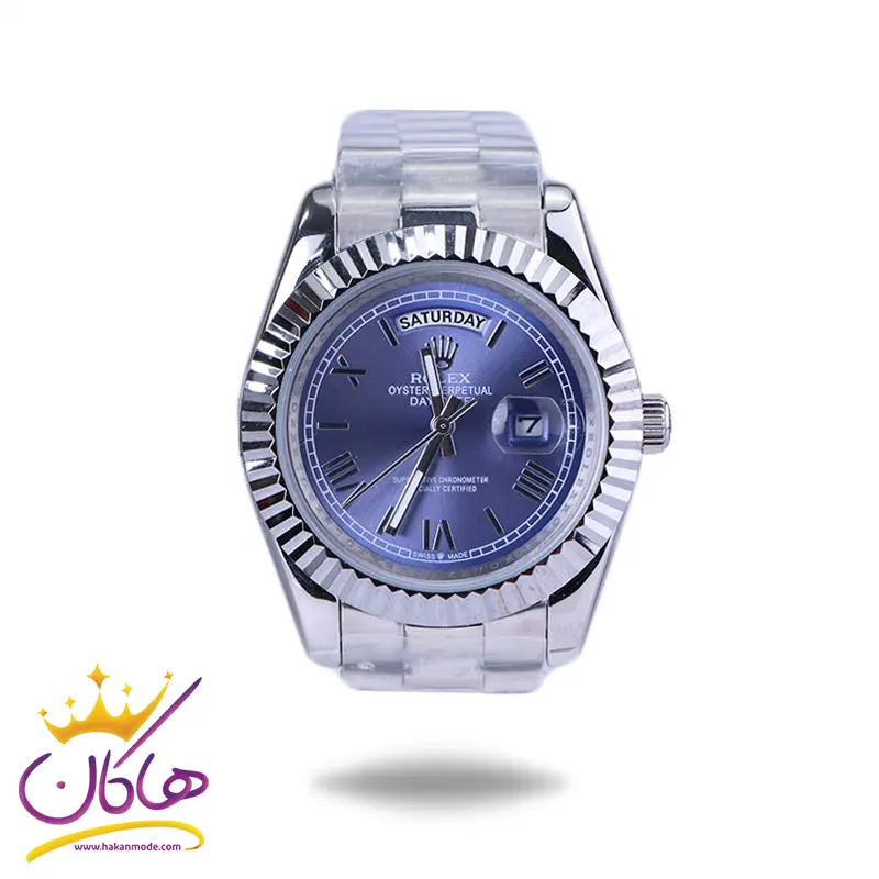 قاب ساعت نقرهای رنگ و کنگرهای است که ظاهر ساعت را جذابتر کرده است. اگر به داخل ساعت نگاه کنید، یک صفحه بنفش مشاهده میکنید که اندکسهایی که زمان ساعت را نشان میدهند به شکل لاتین و نقرهای رنگ طراحی شدهاند. لوگوی برند رولکس که شبیه یک تاج است زیر عدد 12 به خوبی مشخص است. داشتن عقربههای شبنما به شما این امکان را میدهد که در شب و محیطهای کم نور هم گذر زمان را ببینید. تقویم روی عدد 3 قرار گرفته است و با شیشه ذرهبینی که دارد کاملا خوانا و واضح است. یک کادر مستطیل شکل روی عدد 12 قرار دارد که روزهای هفته را نشان میدهد. بند ساعت از بافت یکدست تشکیل شده و نقرهای رنگ میباشد. قفل این ساعت از نوع دوتکه چفتی است و ساعت به راحتی از دست نمیافتد.