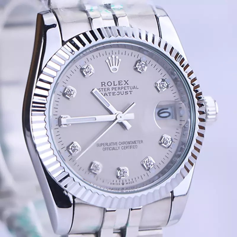 علاوه بر ویژگیهای ظاهری اگر به داخل ساعت نگاه کنید، یک صفحه نقرهای مشاهده میکنید که اندکسهایی که زمان ساعت را نشان میدهند به شکل نگینی خودنمایی میکنند. دور تا دور صفحه ساعت به صورت کنگرهای و نقرهای است. لوگوی برند رولکس که شبیه یک تاج است روی عدد 12 به خوبی مشخص است. داشتن عقربههای شبنما به شما این امکان را میدهد که در شب و محیطهای کم نور هم گذر زمان را ببینید. تقویم روی عدد 3 قرار گرفته است و با شیشه ذرهبینی که دارد کاملا خوانا و واضح است. بند ساعت از یک بافت ریز و درشت تشکیل شده که نقرهای رنگ میباشد. قفل این ساعت بند استیل از نوع دوتکه چفتی است و ساعت به راحتی از دست نمیافتد.