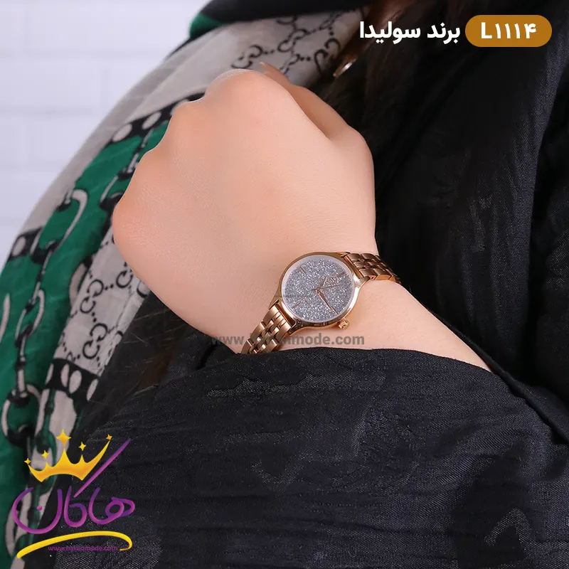 ساعت مچی زنانه سولیدا رزگلد صفحه نگین کد L 1114 نمای روی دست از نزدیک