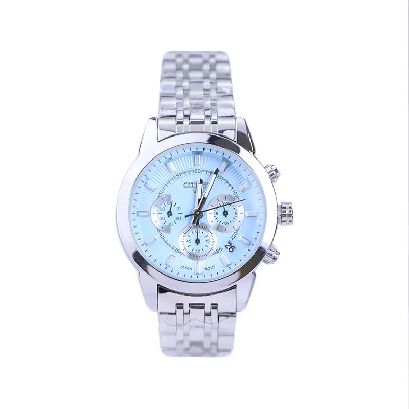 ساعت مچی سیتیزن زنانه فلزی ظاهری مدرن و جذاب دارد. این ساعت استیل نقرهای، رنگ ثابت و ضدحساسیت است. در واقع این ساعت، طرح سه موتوره است و صفحات کوچکی که میبینید، نمایشی هستند. عقربهها، شبنما و اندکسها خطی و شبنما هستند. اگر به درون صفحه آبی تیفانی و شیاردار ساعت نگاه کنید، نام برند Citizen زیر ساعت 12 دیده میشود. یک مربع کوچک بین اعداد 4 و 5 قرار دارد که همان تقویم ساعت است. در کنار صفحه یک پیچ کوک برای تنظیم زمان وجود دارد. بند ساعت، فلزی و از نوع استیل مرغوب است که باعث تعرق و خارش نمیشود. این بند از بافت ریز و درشت تشکیل شده و نقرهای رنگ است. قفل ساعت از مدل پروانهای دکمهدار است که از دسته قفلهای محکم و مطمئن است.