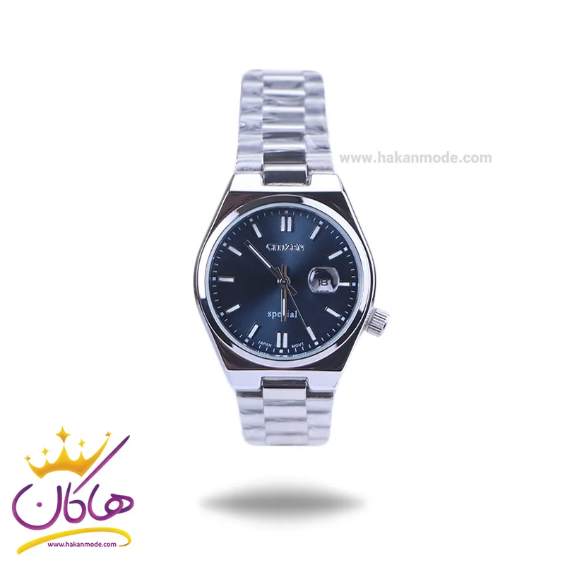 ساعت سیتیزن زنانه فلزی نقرهای ظاهری کلاسیک و جذاب دارد. این ساعت استیل نقرهای، رنگ ثابت و ضدحساسیت است. اصلیترین چیزی که در ساعت زنانه سیتیزن توجه ما را به خود جلب میکند، همخوانی رنگ بند با قاب نقرهای آن است. اگر به درون صفحهی سرمه ای رنگ ساعت نگاه کنید، اندکسها خطی شبنما و عقربهها نقرهای و شبنما هستند. تقویم کنار عدد 3 قرار گرفته است و با شیشه ذره بینی که دارد کاملا خوانا و واضح است. اگر به صفحه ساعت دقت کنید، نام برند سیتیزن زیر ساعت 12 دیده میشود. در کنار صفحه یک پیچ کوک برای تنظیم زمان وجود دارد. بند ساعت، فلزی و از نوع استیل مرغوب است که باعث تعرق و خارش نمیشود. طرح این بند از یک بافت یکدست تشکیل شده است و قفل آن از مدل پروانه ای دکمهدار است که از دسته قفلهای محکم و مطمئن است.