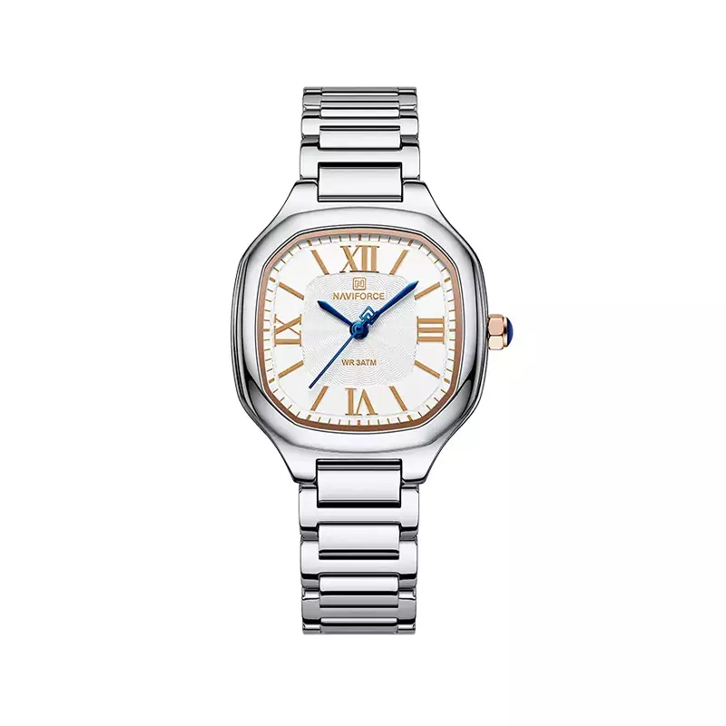 ساعت مچی نیوی فورس زنانه استیل نقرهای ظاهری کلاسیک و جذاب دارد. این ساعت استیل، رنگ ثابت و ضدحساسیت است. اصلیترین چیزی که در ساعت زنانه نیوی فورس توجه ما را به خود جلب میکند، قاب مربع شکل و نقرهای رنگ ساعت است. اگر به درون صفحهی سفید رنگ ساعت نگاه کنید، عقربهها، سرمهای و اندکسها ترکیبی از لاتین و خطی رزگلد هستند. نام برند naviforce زیر ساعت 12 دیده میشود. در کنار صفحه یک پیچ کوک برای تنظیم زمان وجود دارد. بند ساعت، فلزی و از نوع استیل مرغوب است که باعث تعرق و خارش نمیشود. بند ساعت از یک بافت یکدست تشکیل شده و نقرهای است. قفل آن از مدل پروانهای دکمهدار است که از دسته قفلهای محکم و مطمئن است.