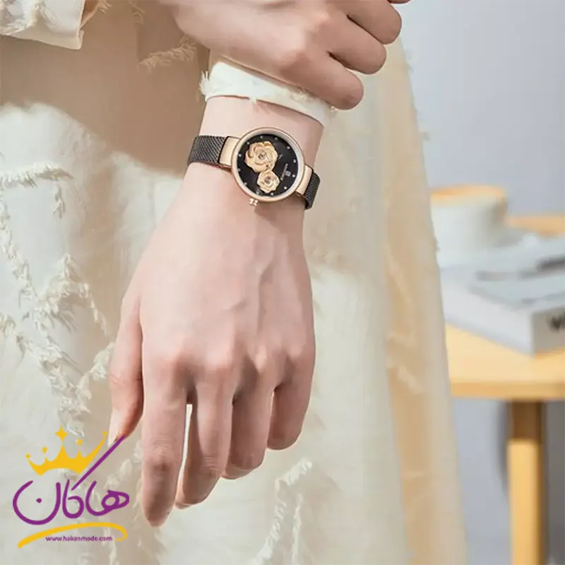ساعت نیوی فورس زنانه فلزی بند حصیری ظاهری کلاسیک و جذاب دارد. این ساعت استیل مشکی رزگلد، رنگ ثابت و ضدحساسیت است. اصلیترین چیزی که در ساعت زنانه نیوی فورس توجه ما را به خود جلب میکند، صفحهی مشکی و گلدار ساعت است. اگر به درون صفحه نگاه کنید، متوجه میشوید که اندکسهایی که زمان ساعت را نشان میدهند به صورت نگینی طراحی شدهاند. نام برند Naviforce زیر ساعت 12 دیده میشود. در کنار صفحه یک پیچ کوک برای تنظیم زمان وجود دارد. بند ساعت طرح حصیری، فلزی و از نوع استیل مرغوب است که باعث تعرق و خارش نمیشود و قفل این ساعت عقربهای زنانه از نوع کلیپسی است به صورت ریلی میتوانید آن را تنظیم کنید.