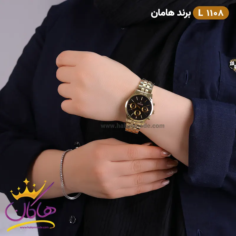 بند ساعت مچی زنانه هامان تمام طلایی صفحه مشکی 1108/10