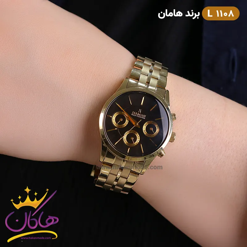 ویژگی ساعت مچی زنانه هامان تمام طلایی صفحه مشکی کد Haman L 1108