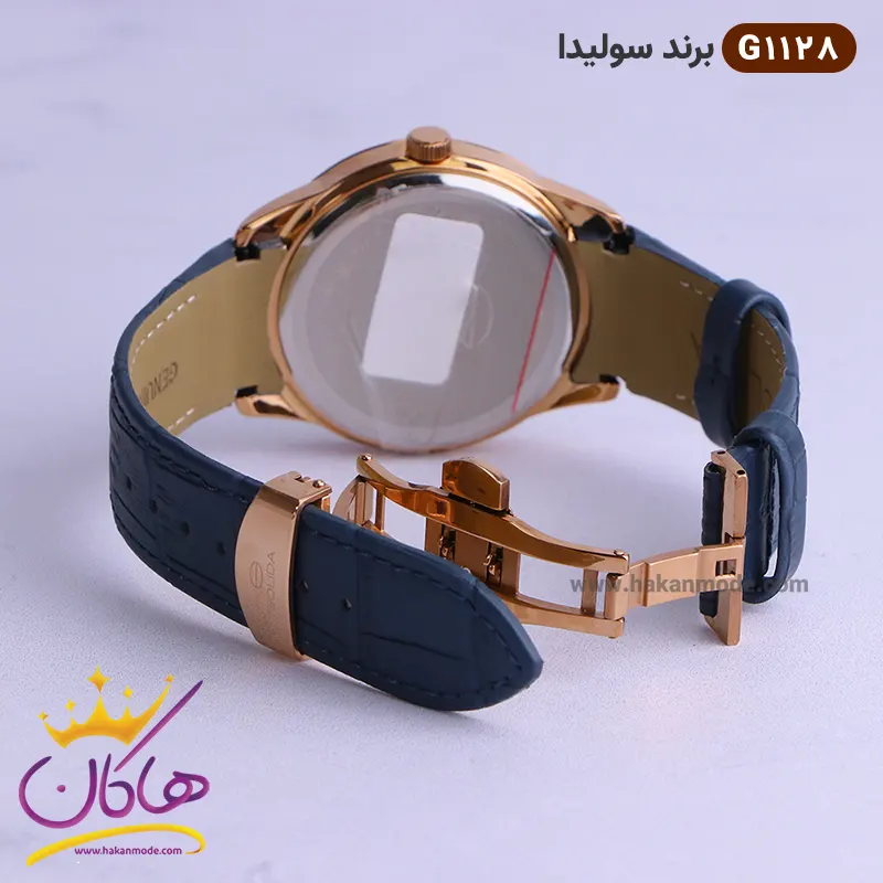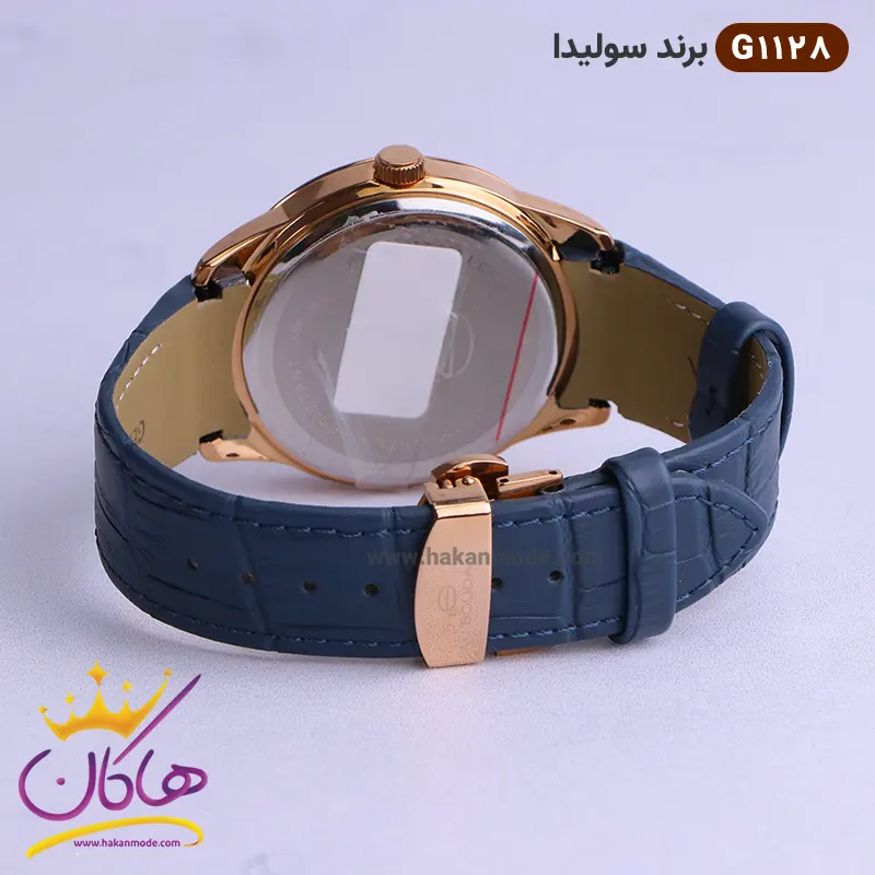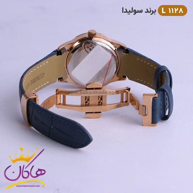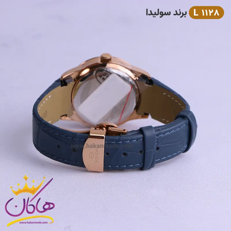 نشان برند سولیدا در قسمت بالا است و در این مدل ساعت هم مردانه و زنانه کاملا شباهت دارند. عقربه رزگلد و شمارشگرهای خطی رزگلد در عین سادگی نیز این ساعت را شیک و جذاب کرده است. جنس قاب و قفل از استیل مرغوب با آبکاری قوی، جنس بند از چرم طبیعی و با کیفیت و شیشه از متریال عالی و ضدخش است. قفل این ساعت از نوع پروانه ای دکمه دار است و ساعت به راحتی از دست نمیافتد.