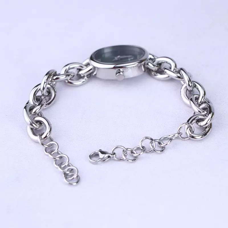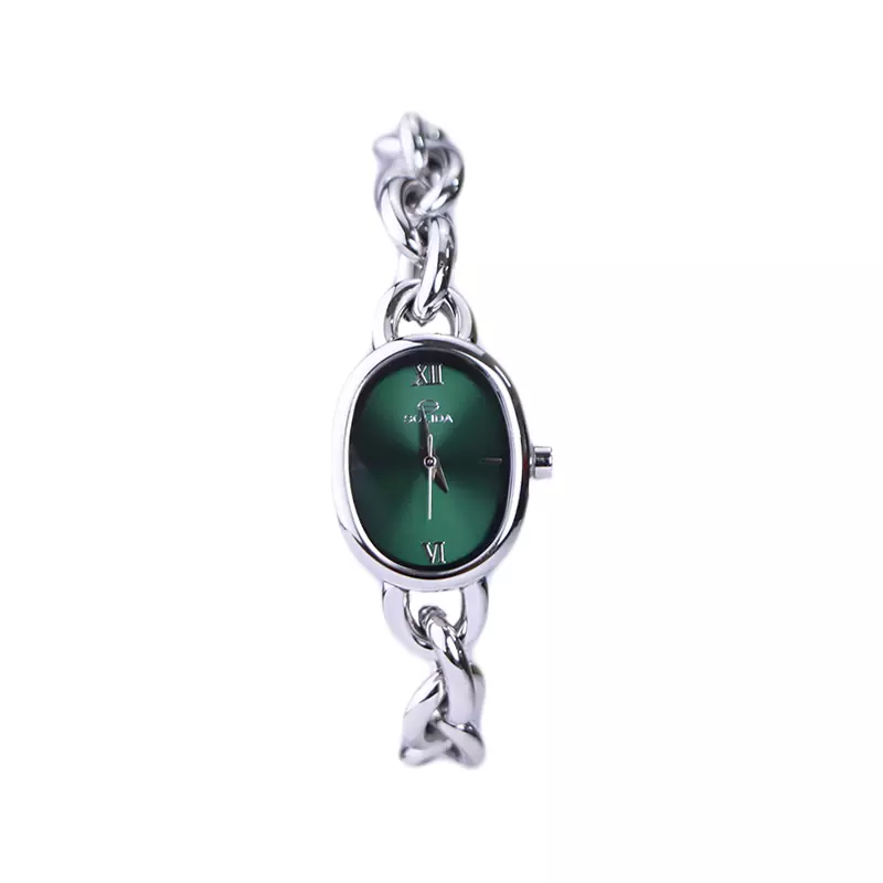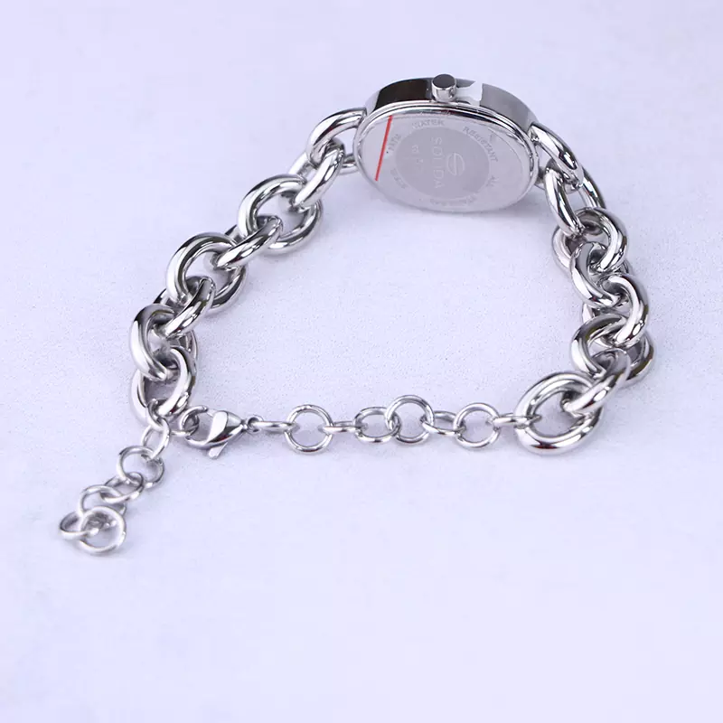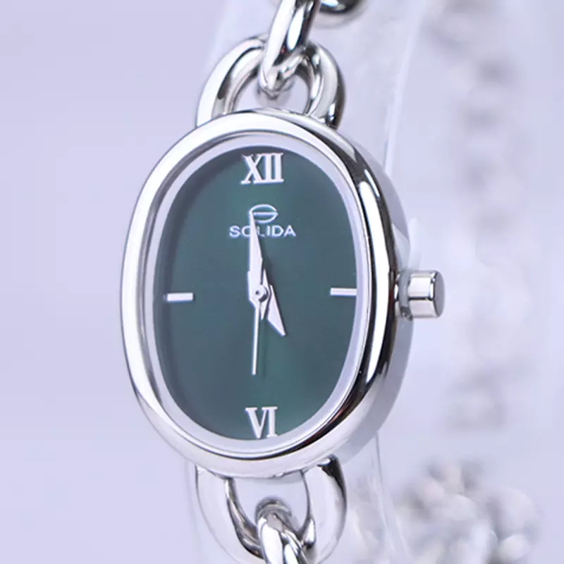 ساعت مچی سولیدا زنانه استیل نقرهای ظاهری کلاسیک و جذاب دارد. این ساعت استیل، رنگ ثابت و ضدحساسیت است. این ساعت زنانه با بند زنجیری نقرهای و درخشان طراحی شده مانند یک دستبند لوکس روی دست مینشیند. قاب ساعت بیضی شکل و صفحهی ساعت سبز رنگ است. عقربهها، نقرهای و اندکسها خطی و لاتین هستند. اگر به درون صفحهی ساعت نگاه کنید، نام برند solida زیر ساعت 12 دیده میشود. در کنار صفحه یک پیچ کوک برای تنظیم زمان وجود دارد. بند ساعت، فلزی و از نوع استیل مرغوب است که باعث تعرق و خارش نمیشود. بند ساعت از حلقههای تو در تو تشکیل شده و نقرهای رنگ است. قفل آن از مدل خرچنگی است که از دسته قفلهای محکم و مطمئن است.