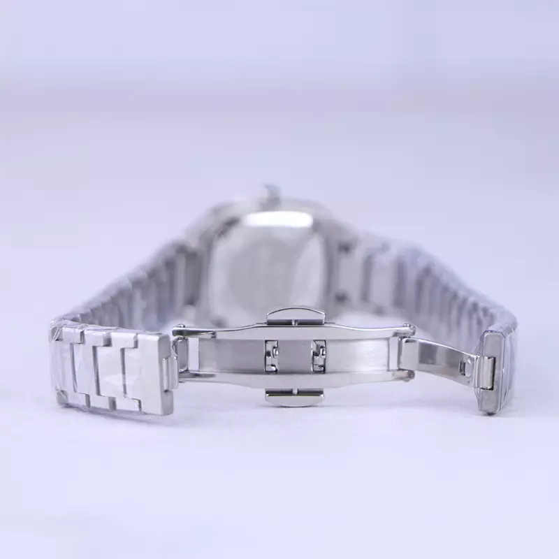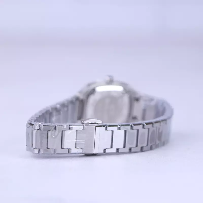 ساعت مچی سولیدا زنانه استیل نقرهای ظاهری کلاسیک و جذاب دارد. این ساعت استیل، رنگ ثابت و ضدحساسیت است. اصلیترین چیزی که در ساعت زنانه سولیدا توجه ما را به خود جلب میکند، قاب مربع شکل و صفحهی سرمهای رنگ ساعت است. اندکسهای ساعت ترکیبی، عددی و لاتینی هستند و عقربههای آن شبنما هستند. یک مربع کوچک روی عدد 6 قرار دارد که همان تقویم ساعت است. اگر به درون صفحهی ساعت نگاه کنید، نام برند solida زیر ساعت 12 دیده میشود. در کنار صفحه یک پیچ کوک برای تنظیم زمان وجود دارد. بند ساعت، فلزی و از نوع استیل مرغوب است که باعث تعرق و خارش نمیشود. بند ساعت از بافت یکدستی تشکیل شده که نقرهای است. قفل آن از مدل پروانهای دکمهدار است که از دسته قفلهای محکم و مطمئن است.