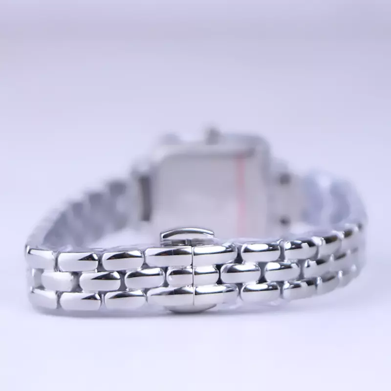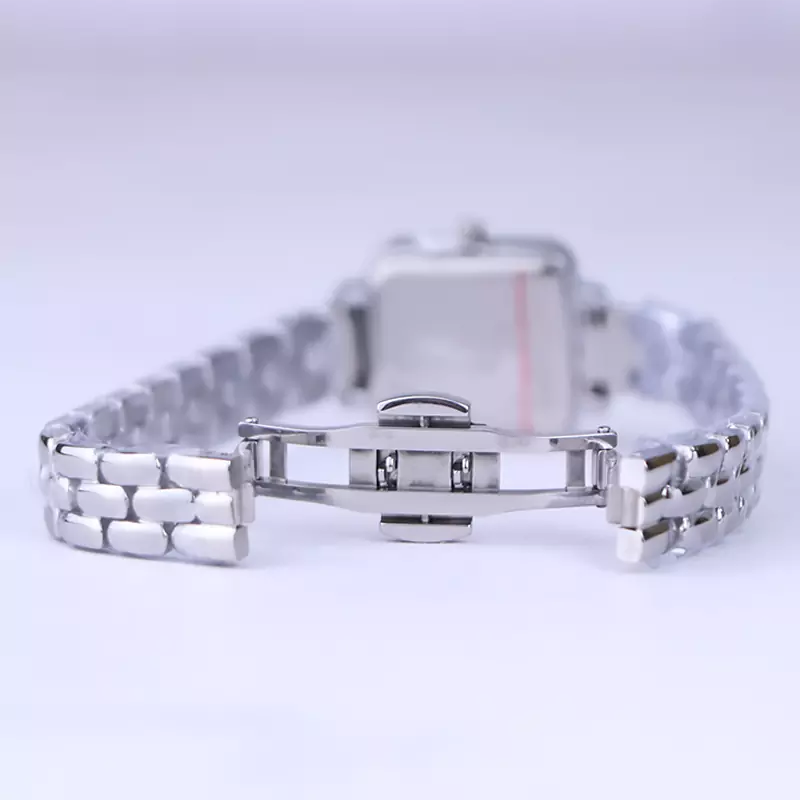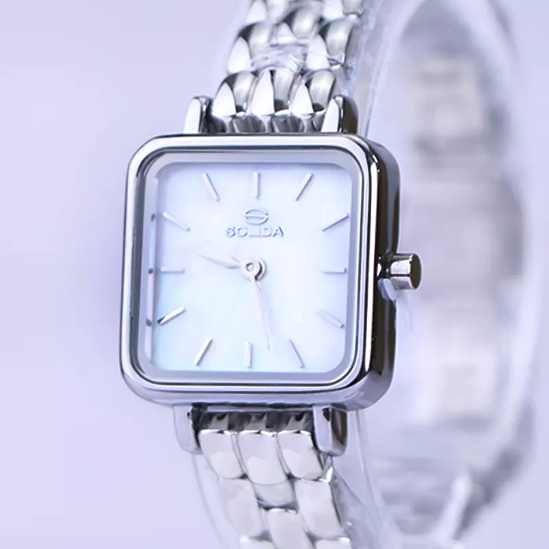 ساعت مچی سولیدا زنانه استیل نقرهای ظاهری کلاسیک و جذاب دارد. این ساعت استیل، رنگ ثابت و ضدحساسیت است. اصلیترین چیزی که در ساعت زنانه سولیدا توجه ما را به خود جلب میکند، قاب مربع شکل و صفحهی سفید رنگ ساعت است. عقربهها، نقرهای و اندکسها خطی هستند. اگر به درون صفحهی ساعت نگاه کنید، نام برند solida زیر ساعت 12 دیده میشود. در کنار صفحه یک پیچ کوک برای تنظیم زمان وجود دارد. بند ساعت، فلزی و از نوع استیل مرغوب است که باعث تعرق و خارش نمیشود. بند ساعت از یک بافت یکدست تشکیل شده که نقرهای است. قفل آن از مدل پروانهای دکمهدار است که از دسته قفلهای محکم و مطمئن است.