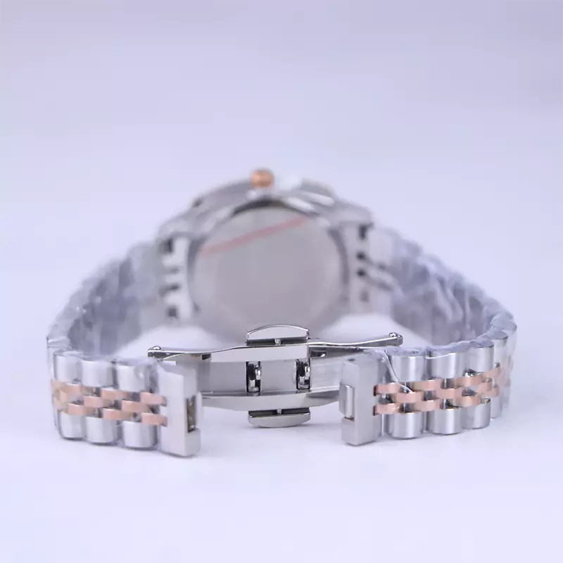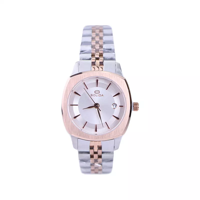 ساعت مچی سولیدا زنانه استیل نقرهای رزگلد ظاهری کلاسیک و جذاب دارد. این ساعت استیل، رنگ ثابت و ضدحساسیت است. اصلیترین چیزی که در ساعت زنانه سولیدا توجه ما را به خود جلب میکند، قاب مربع شکل و صفحهی سفید رنگ ساعت است. عقربهها، رزگلد و اندکسها خطی هستند. یک دایره کوچک کنار عدد 3 قرار دارد که تقویم ساعت است. اگر به درون صفحهی ساعت نگاه کنید، نام برند solida زیر ساعت 12 دیده میشود. در کنار صفحه یک پیچ کوک برای تنظیم زمان وجود دارد. بند ساعت، فلزی و از نوع استیل مرغوب است که باعث تعرق و خارش نمیشود. بند ساعت از یک بافت ریز و درشت تشکیل شده که قسمت میانی آن رزگلد و کنارههای آن نقرهای است. قفل آن از مدل پروانهای دکمهدار است که از دسته قفلهای محکم و مطمئن است.