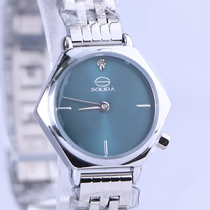 ساعت مچی سولیدا زنانه استیل نقرهای ظاهری کلاسیک و جذاب دارد. این ساعت استیل، رنگ ثابت و ضدحساسیت است. اصلیترین چیزی که در ساعت زنانه سولیدا توجه ما را به خود جلب میکند، قاب چندضلعی و صفحهی آبی رنگ ساعت است. عقربهها، نقرهای و اندکسها خطی هستند. اگر به درون صفحهی ساعت نگاه کنید، نام برند solida زیر ساعت 12 دیده میشود. در کنار صفحه یک پیچ کوک برای تنظیم زمان وجود دارد. بند ساعت، فلزی و از نوع استیل مرغوب است که باعث تعرق و خارش نمیشود. بند ساعت از یک بافت یکدست تشکیل شده که نقرهای است. قفل آن از مدل پروانهای است که از دسته قفلهای محکم و مطمئن است.