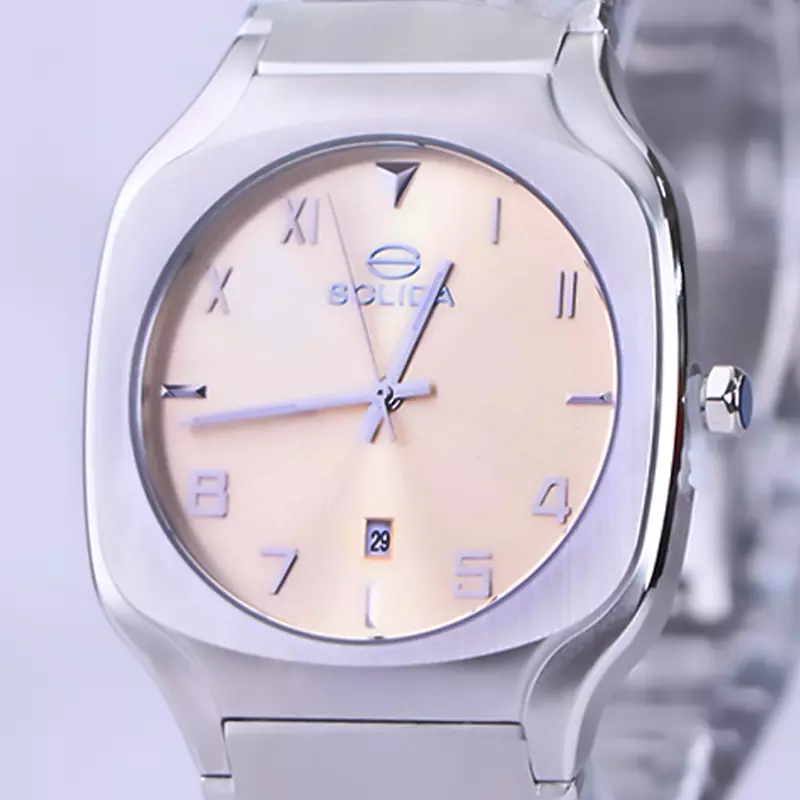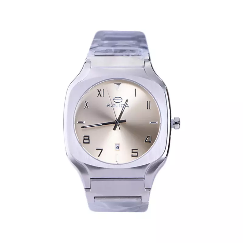 ساعت سولیدا مردانه ظاهری کلاسیک و جذاب دارد. اصلیترین چیزی که در ساعت مردانه سولیدا توجه ما را به خود جلب میکند، قاب مربع شکل و نقرهای رنگ ساعت است. اگر به درون صفحهی طلایی رنگ ساعت نگاه کنید، متوجه میشوید که اندکسهای این ساعت بهصورت ترکیبی، عددی و لاتین طراحی شدهاند. عقربههای آن شبنما هستند. یک مربع کوچک بالای عدد 6 قرار دارد که تقویم ساعت است. نام برند solida زیر ساعت 12 دیده میشود. در کنار صفحه یک پیچ کوک برای تنظیم زمان وجود دارد. این ساعت بند استیل، رنگ ثابت و ضدحساسیت است. بند ساعت از بافت یکدستی تشکیل شده و نقرهای رنگ است. این بند باعث تعرق و خارش نمیشود و قفل آن از مدل پروانهای دکمهدار است که از دسته قفلهای محکم و مطمئن است.