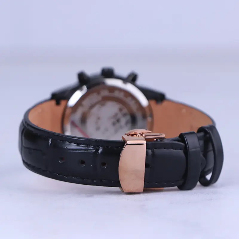 ساعت سیتیزن زنانه بند چرم مشکی ظاهری کلاسیک و جذاب دارد. علاوه بر ویژگیهای ظاهری اگر به داخل ساعت نگاه کنید، سه صفحهی دایرهای کوچک میبینید که هر کدام نشان دهندهی پارامتری خاص هستند. یک صفحه نشانگر ثانیه شمار است. دایرهی سمت چپی تایم دقیقه کرنوگراف را نشان میدهد و دایرهی سمت راست، زمان را به صورت 24 ساعت نشان میدهد. داشتن اندکسهای خطی و عقربههای شب رنگ به شما این امکان را میدهد که در شب و محیطهای کم نور هم گذر زمان را ببینید. یک مربع کوچک بین اعداد 4 و 5 قرار دارد که تقویم ساعت است. در کنار این ساعت بند چرم یک پین (دسته کوک) و دو دکمه قرار دارد که پین برای تنظیم تقویم و ساعت است. قفل این ساعت از نوع پروانهای دکمهدار است و ساعت به راحتی از دست نمیافتد. اگر به درون صفحه مشکی ساعت نگاه کنید، نام برند سیتیزن زیر ساعت 12 دیده میشود. بند ساعت از نوع چرم مرغوب که پوسته پوسته و بریده نمیشود. این بند باعث تعرق و خارش نمیشود.