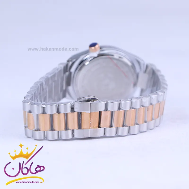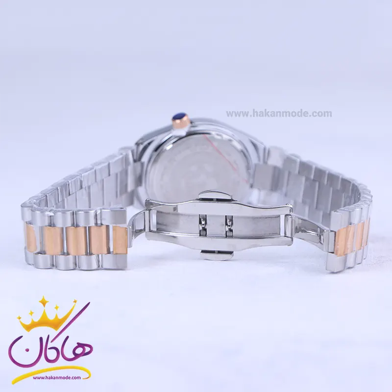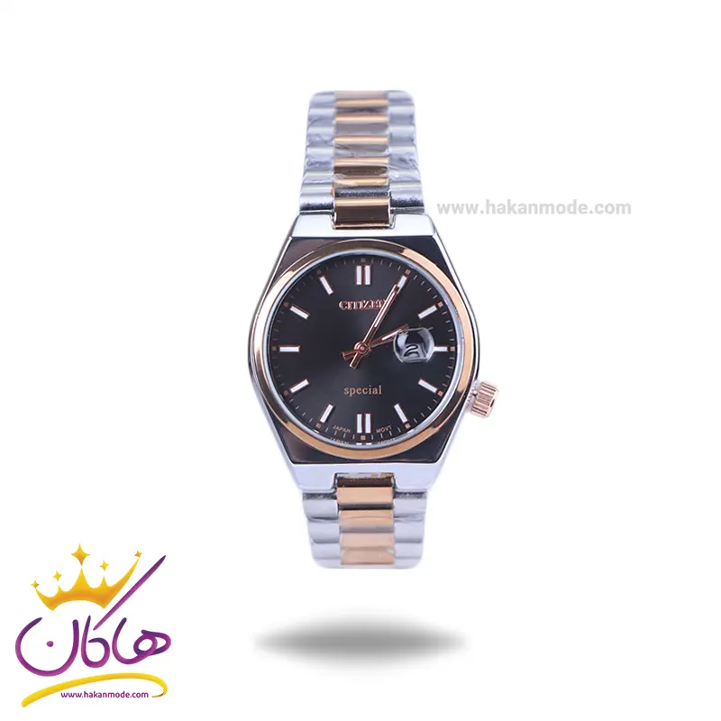ساعت سیتیزن زنانه فلزی نقرهای رزگلد ظاهری کلاسیک و جذاب دارد. این ساعت استیل، رنگ ثابت و ضدحساسیت است. اصلیترین چیزی که در ساعت زنانه سیتیزن توجه ما را به خود جلب میکند، همخوانی رنگ بند با قاب رزگلد آن است. اگر به درون صفحهی مشکی رنگ ساعت نگاه کنید، اندکسها شبنما و خطی و عقربهها رزگلد و شبنما هستند. تقویم کنار عدد 3 قرار گرفته است و با شیشه ذره بینی که دارد کاملا خوانا و واضح است. اگر به صفحه ساعت دقت کنید، نام برند سیتیزن زیر ساعت 12 دیده میشود. در کنار صفحه یک پیچ کوک برای تنظیم زمان وجود دارد. بند ساعت، فلزی و از نوع استیل مرغوب است که باعث تعرق و خارش نمیشود. طرح این بند از یک بافت یکدست تشکیل شده که قسمت میانی آن رزگلد و کنارههای آن نقرهای رنگ است. قفل آن از مدل پروانه ای دکمهدار است که از دسته قفلهای محکم و مطمئن است.
