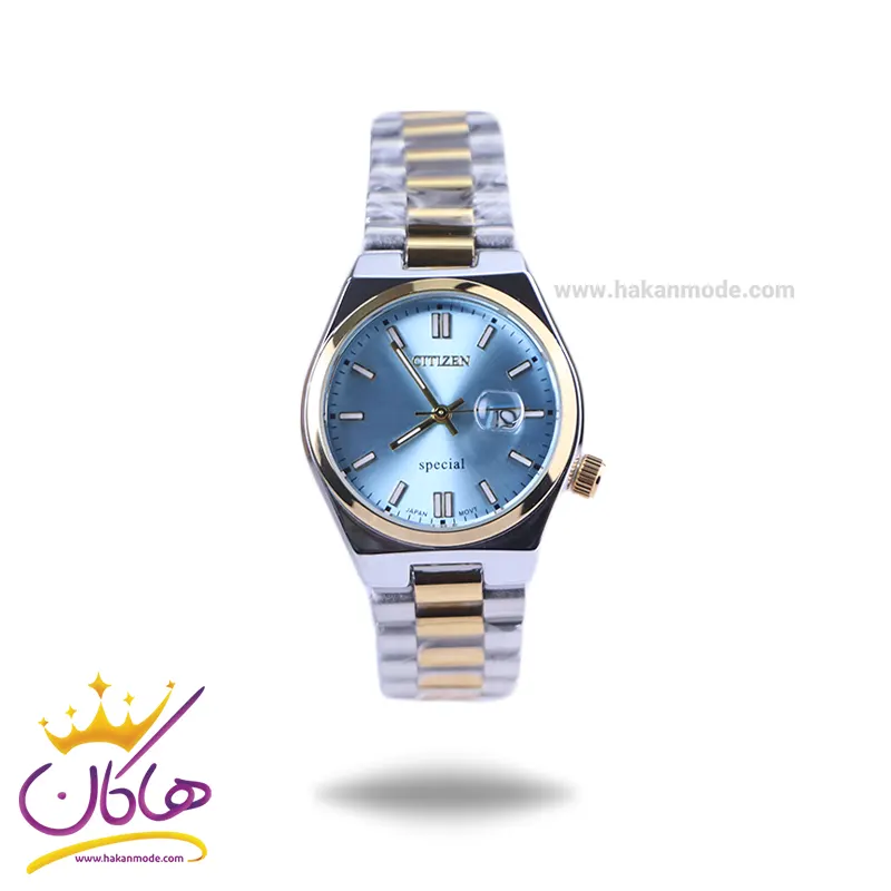 ساعت سیتیزن زنانه فلزی نقرهای طلایی ظاهری کلاسیک و جذاب دارد. این ساعت استیل، رنگ ثابت و ضدحساسیت است. اصلیترین چیزی که در ساعت زنانه سیتیزن توجه ما را به خود جلب میکند، همخوانی رنگ بند با قاب طلایی آن است. اگر به درون صفحهی آبی رنگ ساعت نگاه کنید، اندکسها خطی و عقربهها طلایی و شبنما هستند. تقویم کنار عدد 3 قرار گرفته است و با شیشه ذره بینی که دارد کاملا خوانا و واضح است. اگر به صفحه ساعت دقت کنید، نام برند سیتیزن زیر ساعت 12 دیده میشود. در کنار صفحه یک پیچ کوک برای تنظیم زمان وجود دارد. بند ساعت، فلزی و از نوع استیل مرغوب است که باعث تعرق و خارش نمیشود. طرح این بند از یک بافت یکدست تشکیل شده که قسمت میانی آن طلایی و کنارههای آن نقرهای رنگ است. قفل آن از مدل پروانه ای دکمهدار است که از دسته قفلهای محکم و مطمئن است.