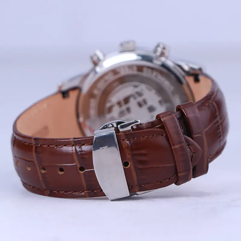 ساعت سیتیزن مردانه بند چرم قهوهای ظاهری کلاسیک و جذاب دارد. علاوه بر ویژگیهای ظاهری اگر به داخل ساعت نگاه کنید، سه صفحهی دایرهای قاب نقرهای کوچک میبینید که هر کدام نشان دهندهی پارامتری خاص هستند. یک صفحه نشانگر ثانیه شمار است. دایرهی سمت چپی تایم دقیقه کرنوگراف را نشان میدهد و دایرهی سمت راستی، زمان را به صورت 24 ساعت نشان میدهد. داشتن اندکسهای خطی نقرهای و عقربههای شب رنگ به شما این امکان را میدهد که در شب و محیطهای کم نور هم گذر زمان را ببینید. یک مربع کوچک بین اعداد 4 و 5 قرار دارد که نشاندهندهی تقویم ساعت است. در کنار این ساعت بند چرم یک پین (دسته کوک) و دو دکمه قرار دارد که پین برای تنظیم تقویم و ساعت است. قفل این ساعت از نوع پروانهای دکمهدار است و ساعت به راحتی از دست نمیافتد. اگر به درون صفحه نقرهای ساعت نگاه کنید، نام برند سیتیزن زیر ساعت 12 دیده میشود. بند ساعت از نوع چرم مرغوب که پوسته پوسته و بریده نمیشود. این بند باعث تعرق و خارش نمیشود.