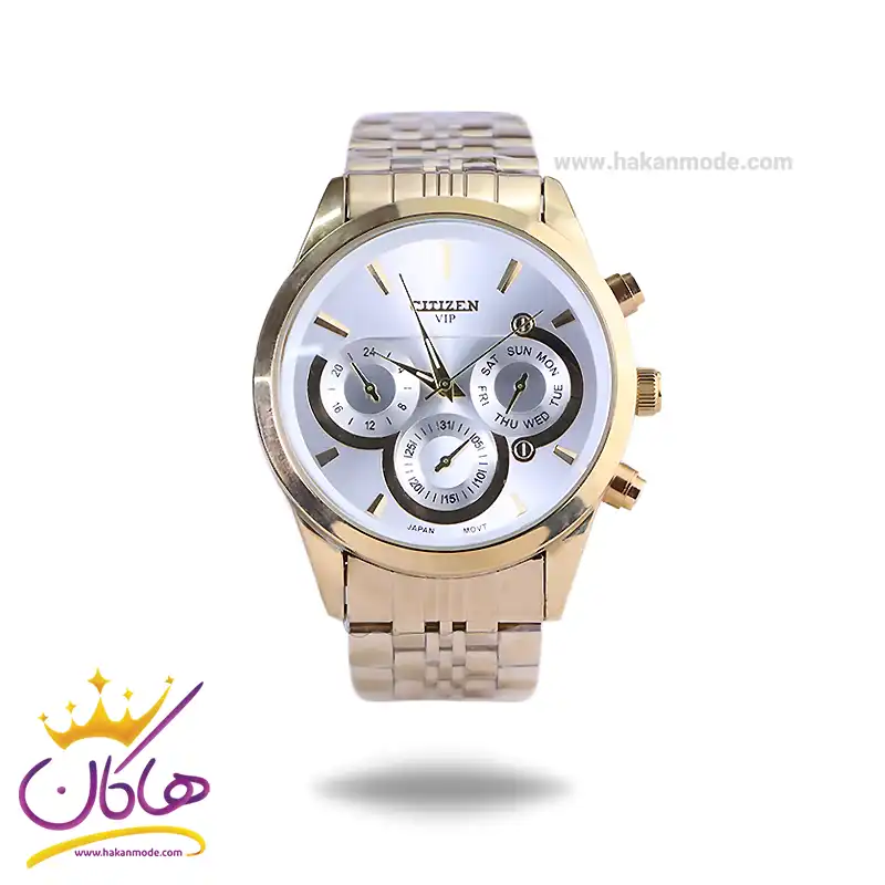 ساعت مچی سیتیزن مردانه فلزی طلایی ظاهری مدرن و جذاب دارد. این ساعت استیل طلایی، رنگ ثابت و ضدحساسیت است. اصلیترین چیزی که در ساعت مردانه سیتیزن توجه ما را به خود جلب میکند، سه صفحه دایرهای کوچک است که هر کدام نشان دهندهی پارامتری خاص هستند. یک صفحه ساعت را به صورت ۲۴ ساعت نشان می دهد. گزینه بعدی روزهای هفته را نشان میدهد. دایرهی بعدی نشان دهندهی عدد روزهای ماه است. اندکسها، شبنما و خطی هستند. اگر به درون صفحه سفید رنگ ساعت نگاه کنید، نام برند سیتیزن زیر ساعت 12 دیده میشود. در کنار صفحه یک پیچ کوک برای تنظیم زمان وجود دارد. بند ساعت، فلزی و از نوع استیل مرغوب است که باعث تعرق و خارش نمیشود. طرح این بند رولکسی است و قفل آن از مدل پروانه ای دکمهدار است که از دسته قفلهای محکم و مطمئن است.