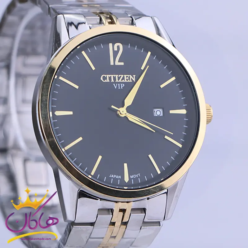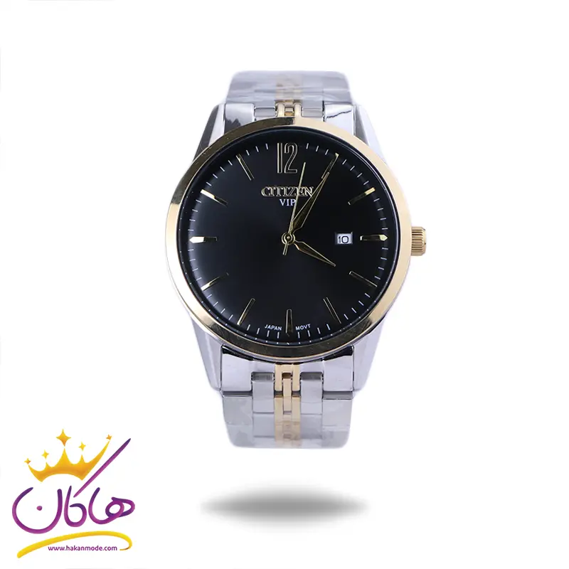 ساعت مچی سیتیزن مردانه فلزی ظاهری کلاسیک و جذاب دارد. این ساعت استیل نقرهای طلایی، رنگ ثابت و ضدحساسیت است. اصلیترین چیزی که در ساعت مردانه سیتیزن توجه ما را به خود جلب میکند، صفحهی مشکی رنگ ساعت است که بر شیکی آن افزوده است. قاب ساعت به شکل گرد و طلایی است. عقربهها طلایی و اندکسهای ساعت خطی هستند. در کنار موقعیت ساعت 3 یک مربع کوچک وجود دارد که نشان دهندهی تقویم ساعت است. اگر به درون صفحه نگاه کنید، نام برند سیتیزن زیر ساعت 12 دیده میشود. در کنار صفحه یک پیچ کوک برای تنظیم زمان وجود دارد. بند ساعت، فلزی و از نوع استیل مرغوب است که باعث تعرق و خارش نمیشود. طرح این بند از یک بافت ریز و درشت تشکیل شده که قسمت میانی طلایی و کنارههای آن نقرهای رنگ است و قفل آن از مدل پروانهای دکمهدار است که از دسته قفلهای محکم و مطمئن است.