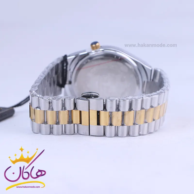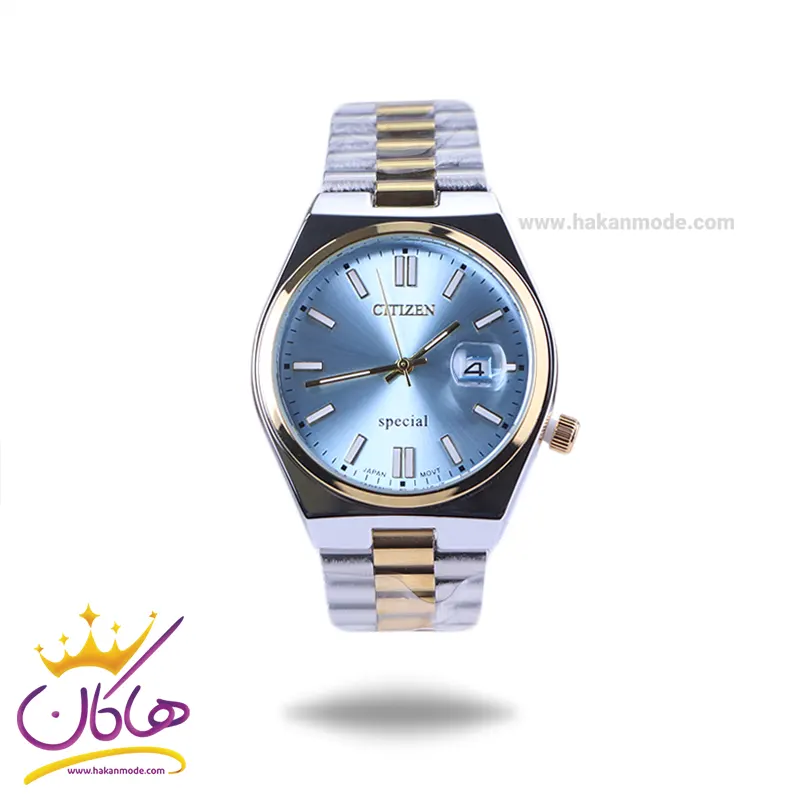 ساعت سیتیزن مردانه فلزی نقرهای طلایی ظاهری کلاسیک و جذاب دارد. این ساعت استیل نقرهای طلایی، رنگ ثابت و ضدحساسیت است. اصلیترین چیزی که در ساعت مردانه سیتیزن توجه ما را به خود جلب میکند، همخوانی رنگ بند با قاب طلایی آن است. اگر به درون صفحهی آبی رنگ ساعت نگاه کنید، اندکسها خطی و عقربهها طلایی و شبنما هستند. تقویم کنار عدد 3 قرار گرفته است و با شیشه ذره بینی که دارد کاملا خوانا و واضح است. اگر به صفحه ساعت دقت کنید، نام برند سیتیزن زیر ساعت 12 دیده میشود. در کنار صفحه یک پیچ کوک برای تنظیم زمان وجود دارد. بند ساعت، فلزی و از نوع استیل مرغوب است که باعث تعرق و خارش نمیشود. طرح این بند از یک بافت یکدست تشکیل شده که قسمت میانی آن طلایی و کنارههای آن نقرهای رنگ است. قفل آن از مدل پروانه ای دکمهدار است که از دسته قفلهای محکم و مطمئن است.